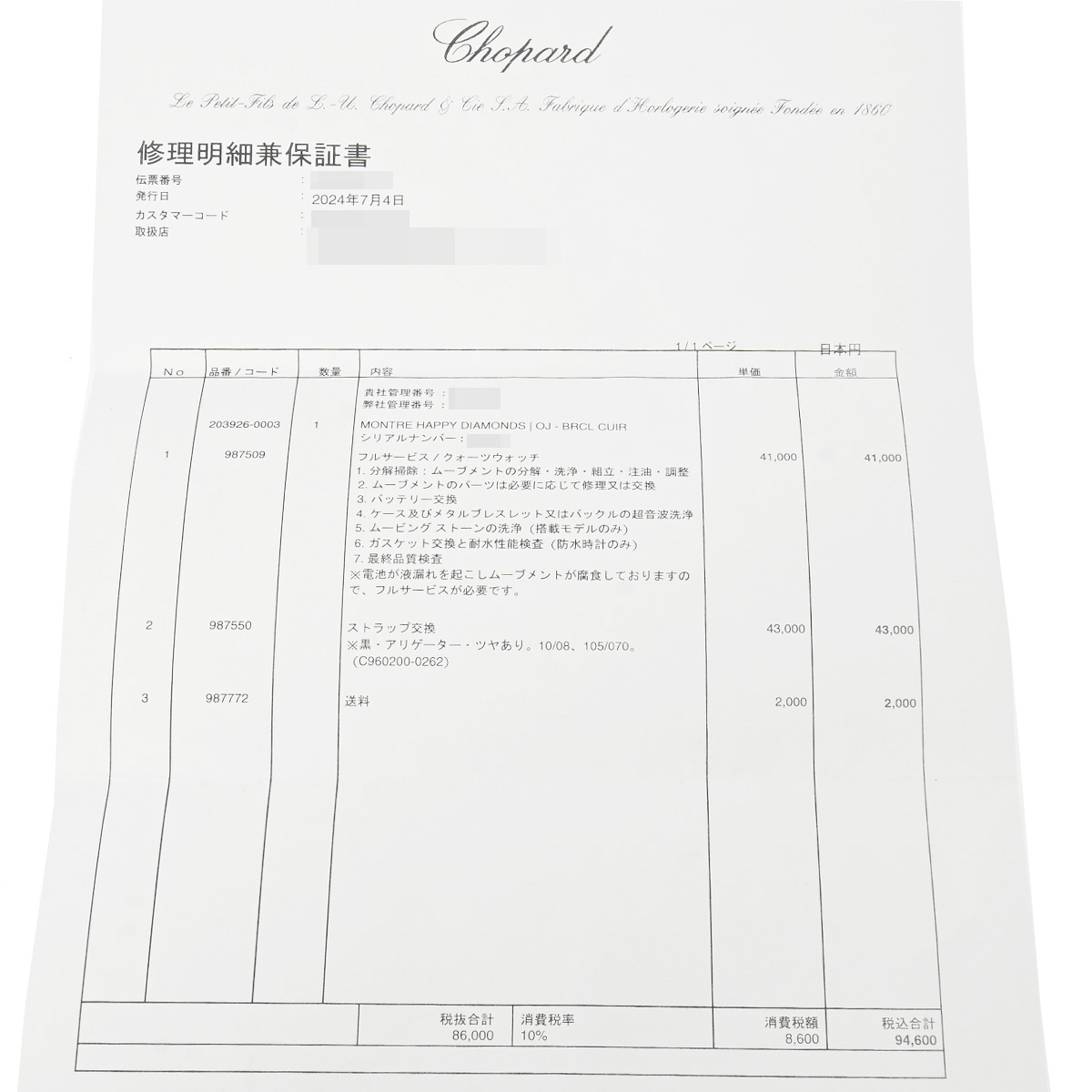 - 修理明細兼保証書(2024年7月の記載)