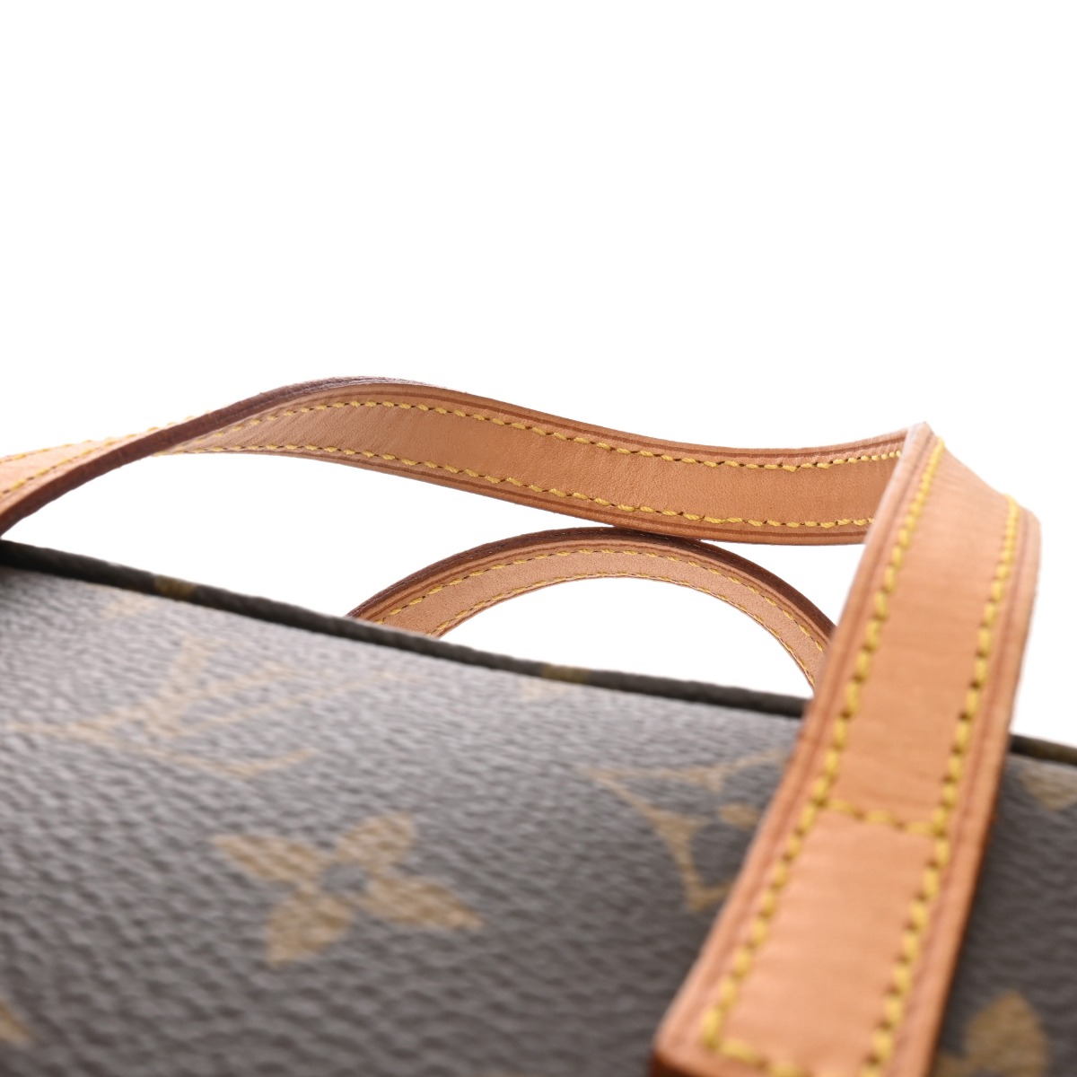- 少々テカリやスレ、少々つぶれ、ヌメ革部分にシミなど少々使用感、持ち手にクセ、金具部分に色ハゲなど若干使用感がございます。
