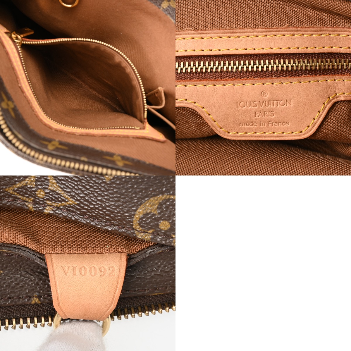 - たたみクセ、つぶれ、テカリ、薄汚れ、スレ、ショルダーにクセやシワ、コバスレ、底含めヌメ革部分にヤケやシミ、スレキズ、金具部分に変色や色ハゲ、スリキズなど使用感がございます。