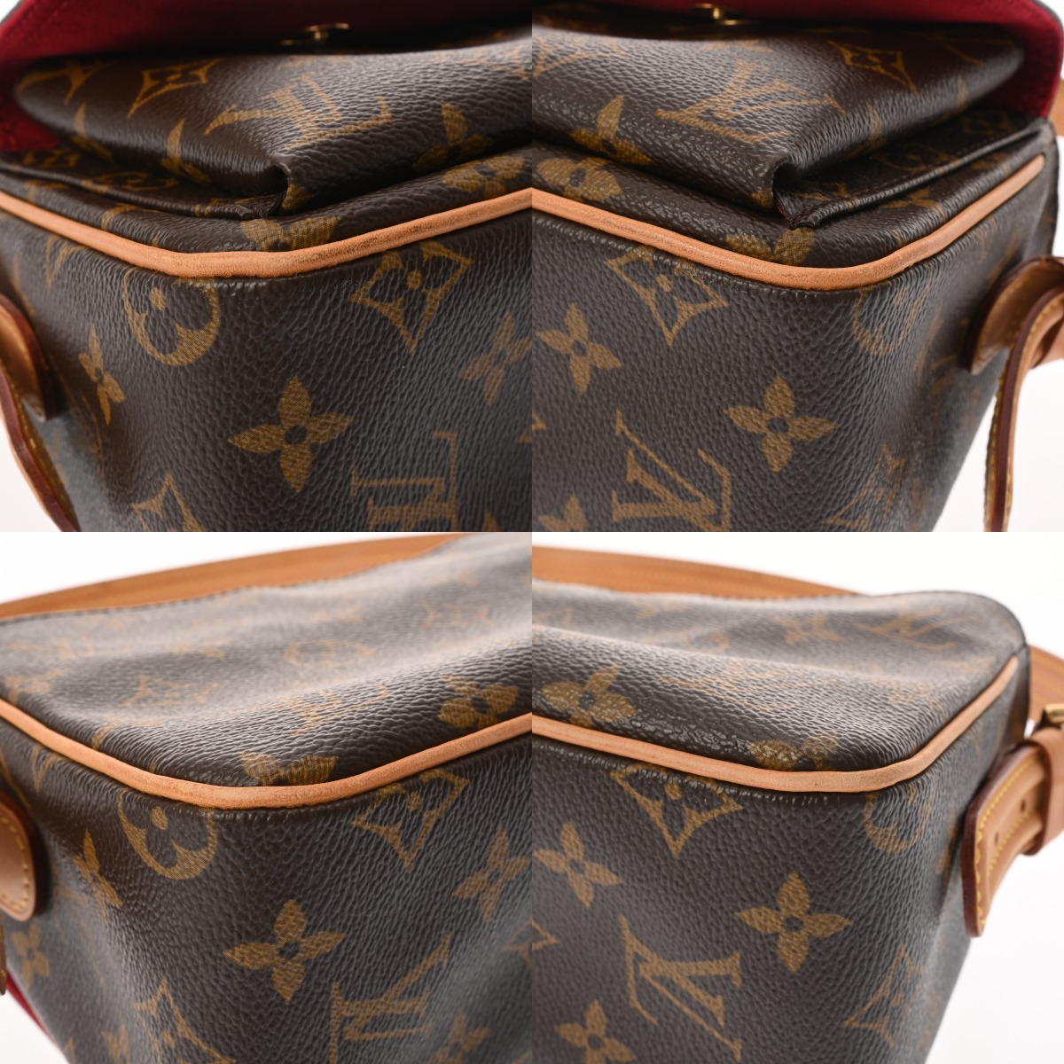 - つぶれ、テカリ、薄汚れ、スレ、フラップに反り、ショルダーにクセ、ヌメ革にヤケ、金具にスリキズなど少々使用感がございます。