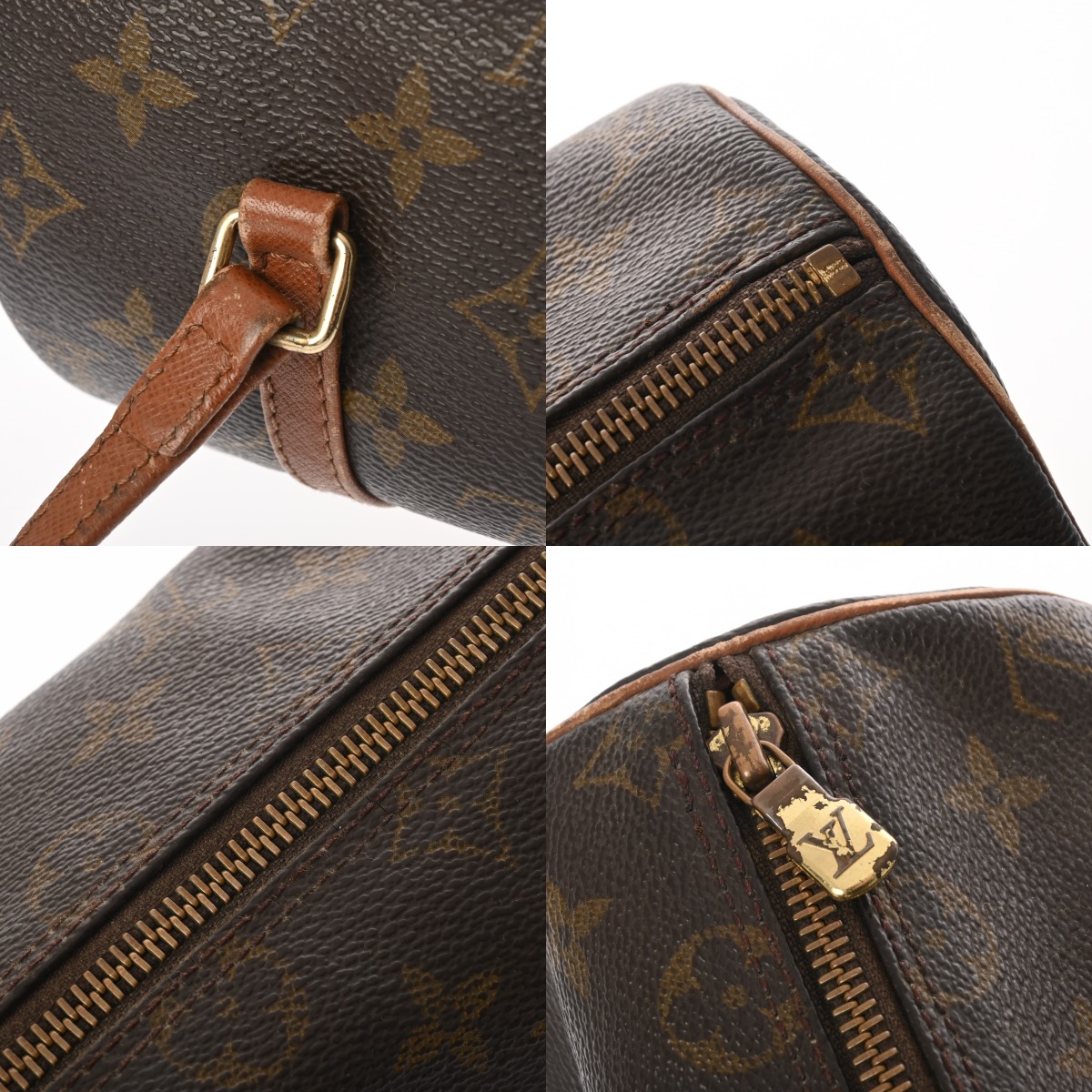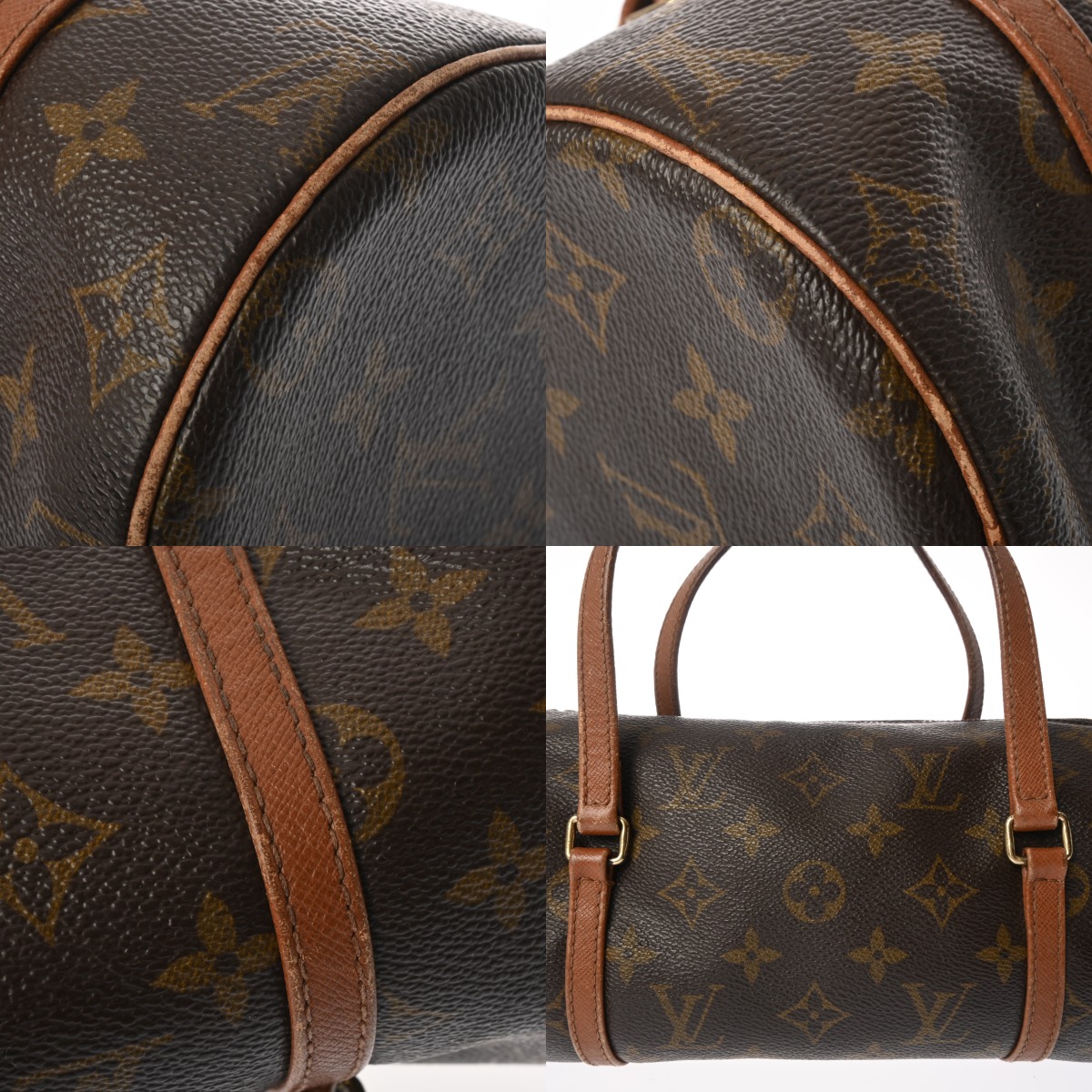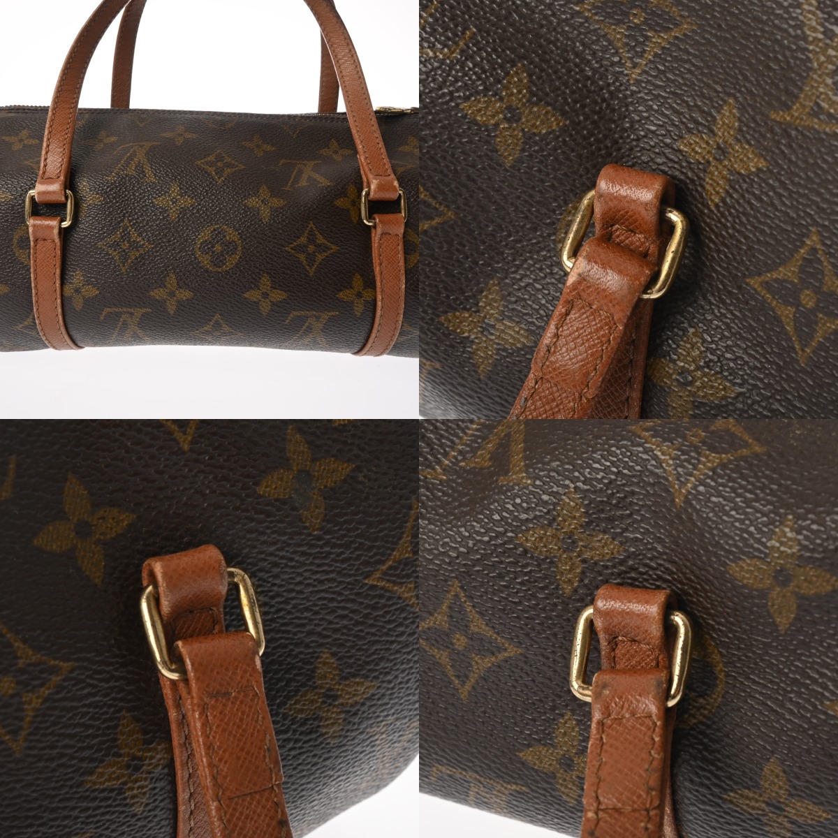 - 型崩れ、少々汚れ、テカリ、パイピングやコバにスレ、持ち手含めレザー部分にスレや黒ずみなど使用感、金具部分に変色やメッキハガレがございます。