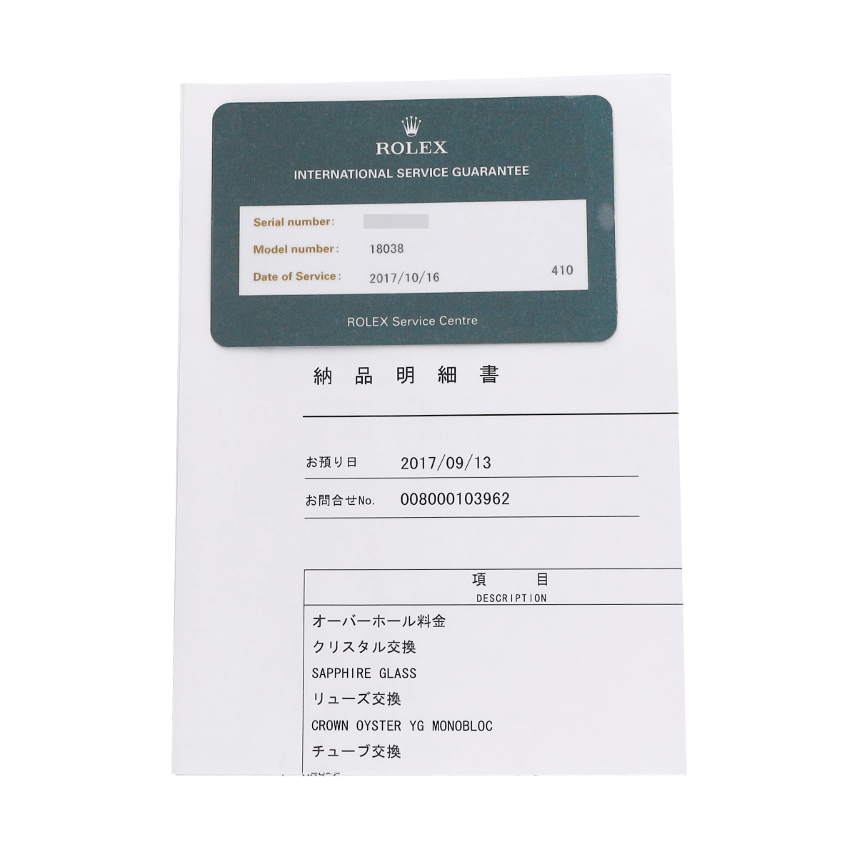 - 納品明細書/国際サービス保証書(2017年10月オーバーホール)