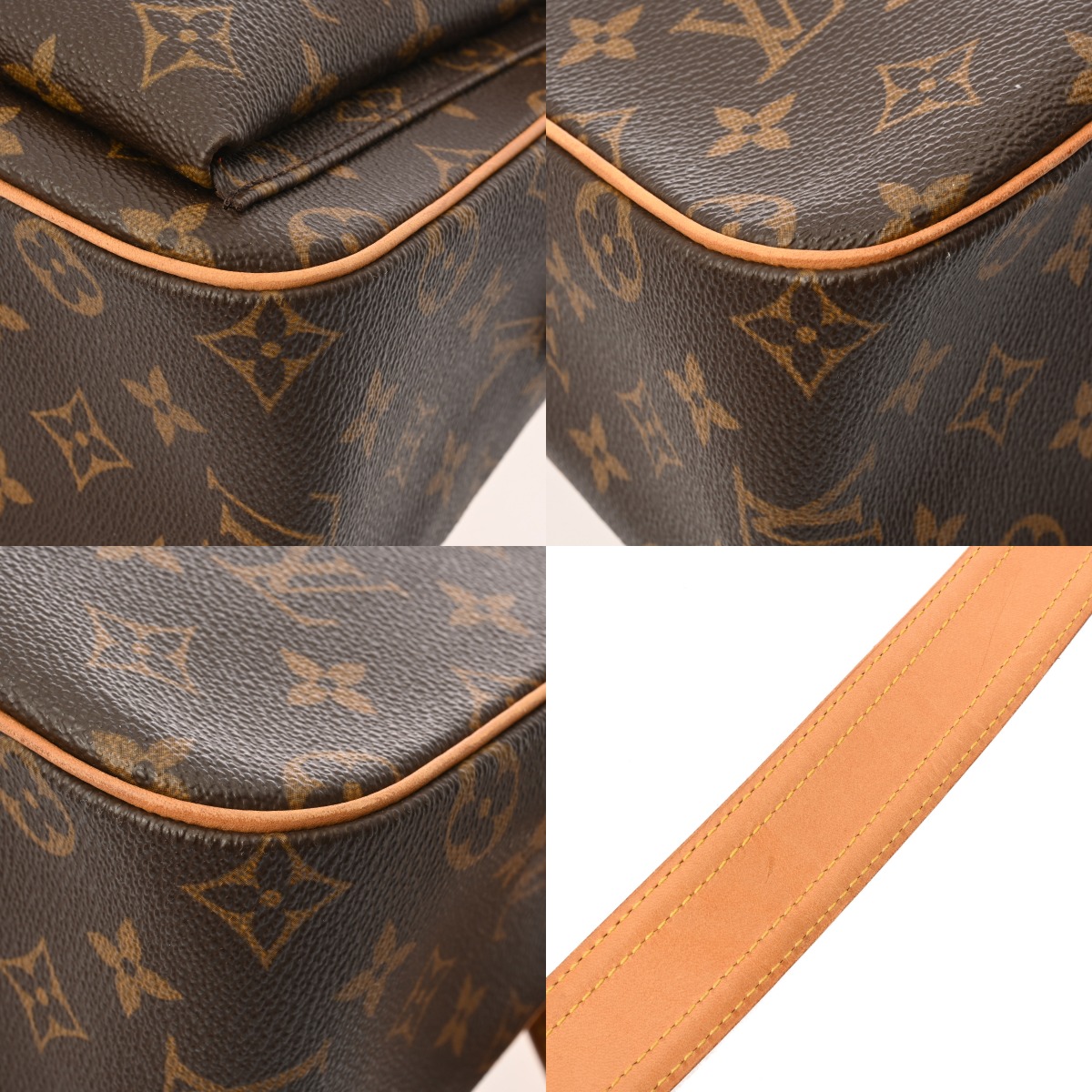 - つぶれ、テカリ、薄汚れ、スレ、ショルダーにクセやハゲ、ヌメ革にヤケやシミ、金具に色ハゲやスリキズなど少々使用感がございます。
