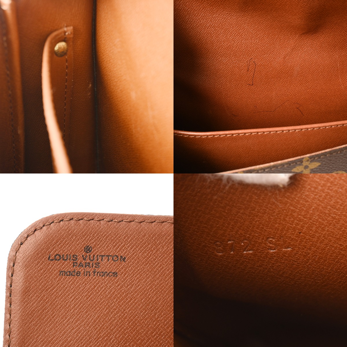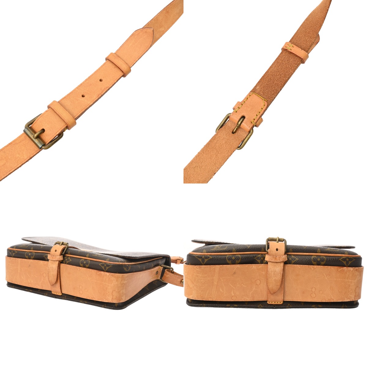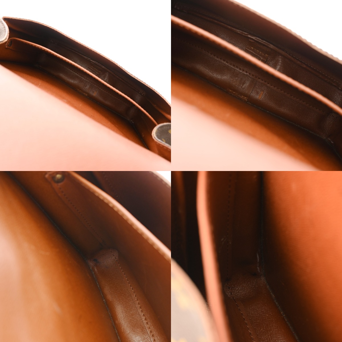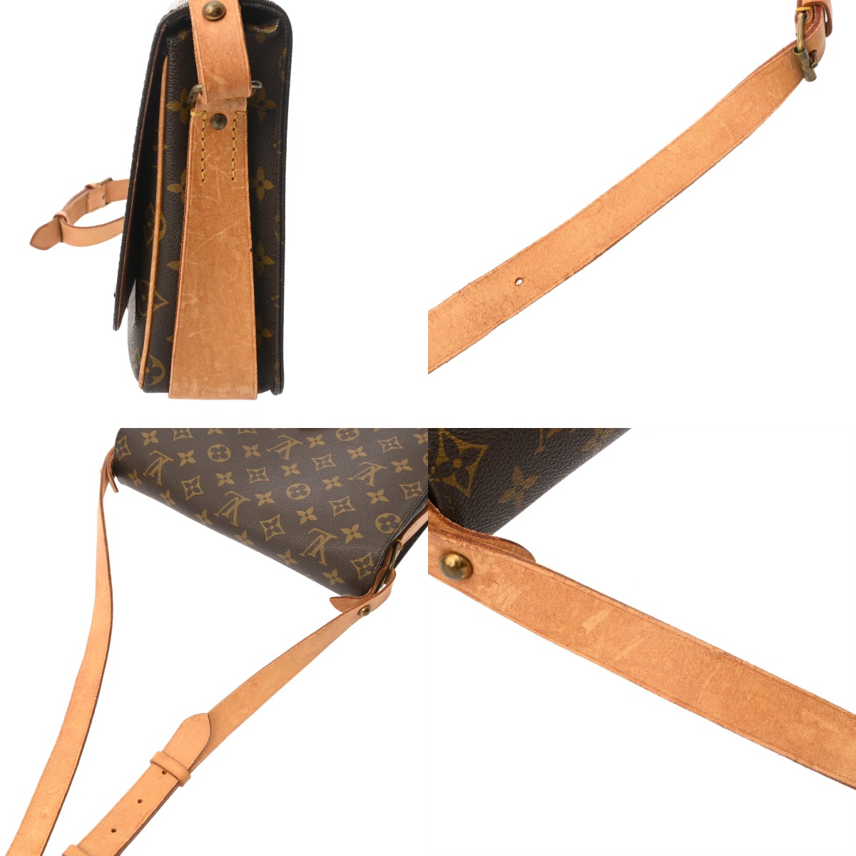 - ヌメ革ヤケ、スレ、シミなどのダメージ、開閉ベルト、ショルダーにクセ、金具に色ハゲ、スリキズなど使用感がございます。