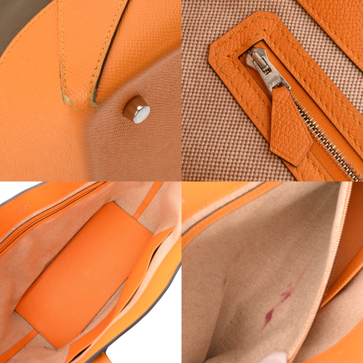 - 薄汚れ、毛羽立ち、スレ、バッグ口のペン跡、ポケットにヨレ、広がり、金具にくすみなど使用感がございます。