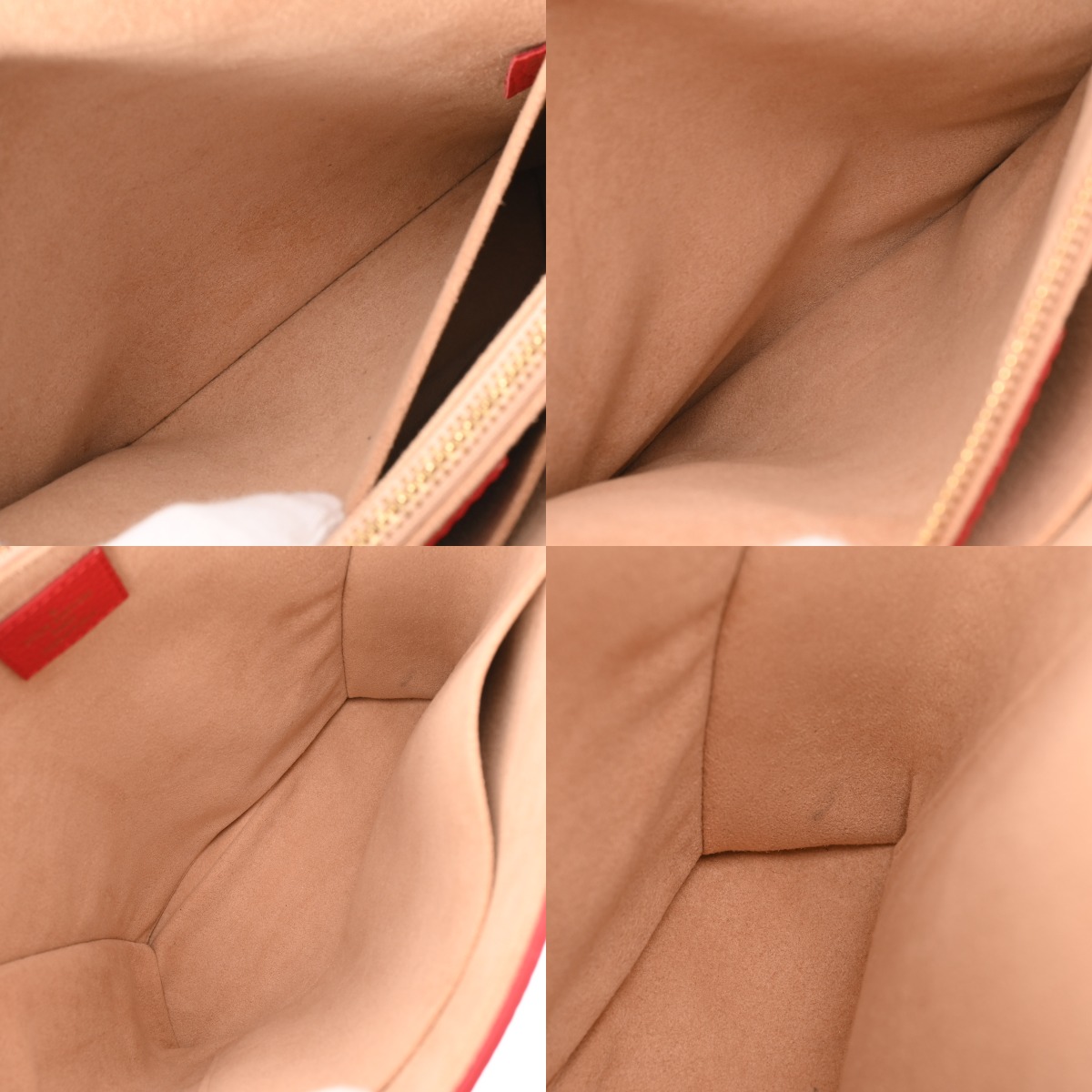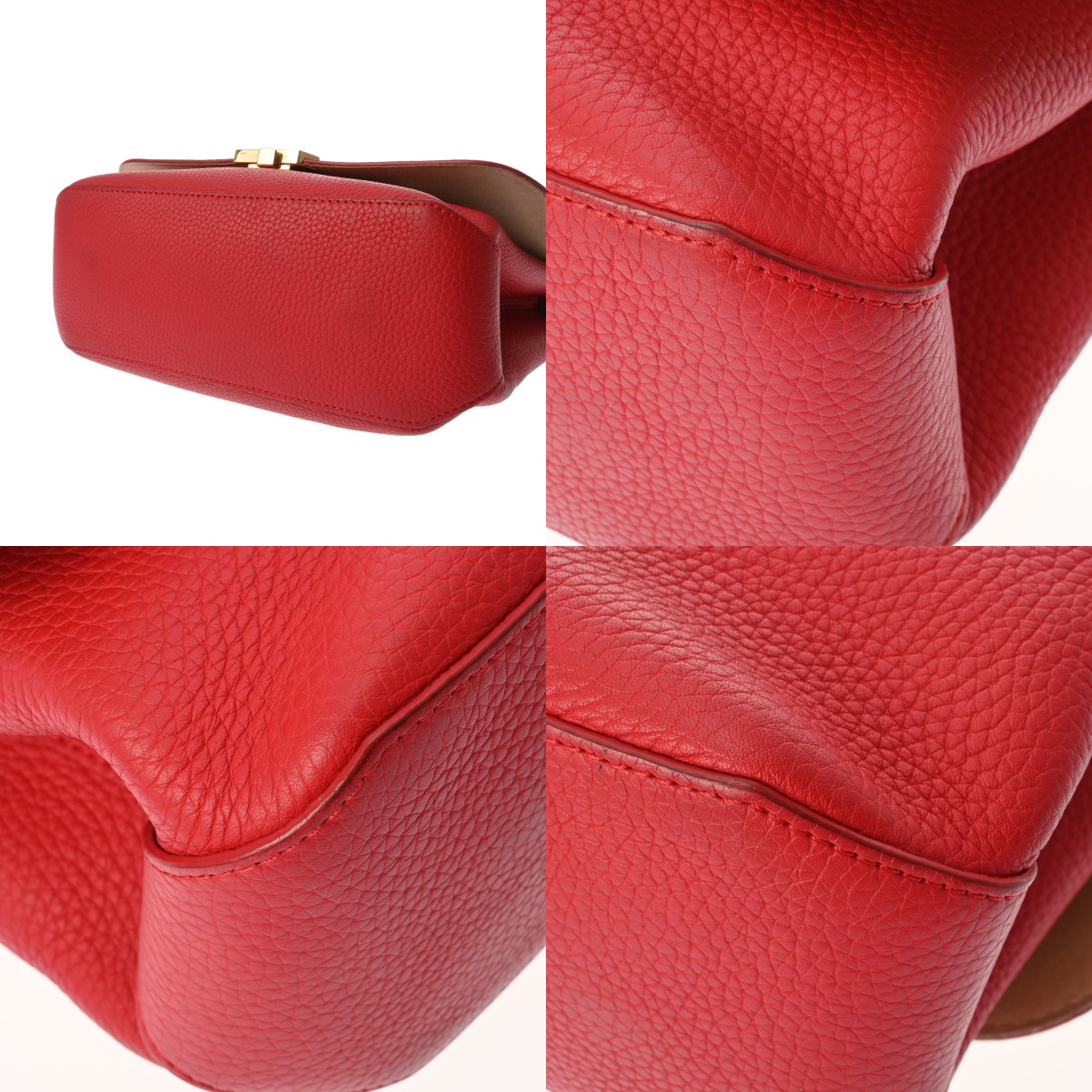 - たたみクセ、薄汚れ、シワ、スレ、持ち手付け根コバに繊維の出、ショルダーにクセ、コバハゲ、繊維付着、金具に色ハゲ、スリキズなど少々使用感がございます。