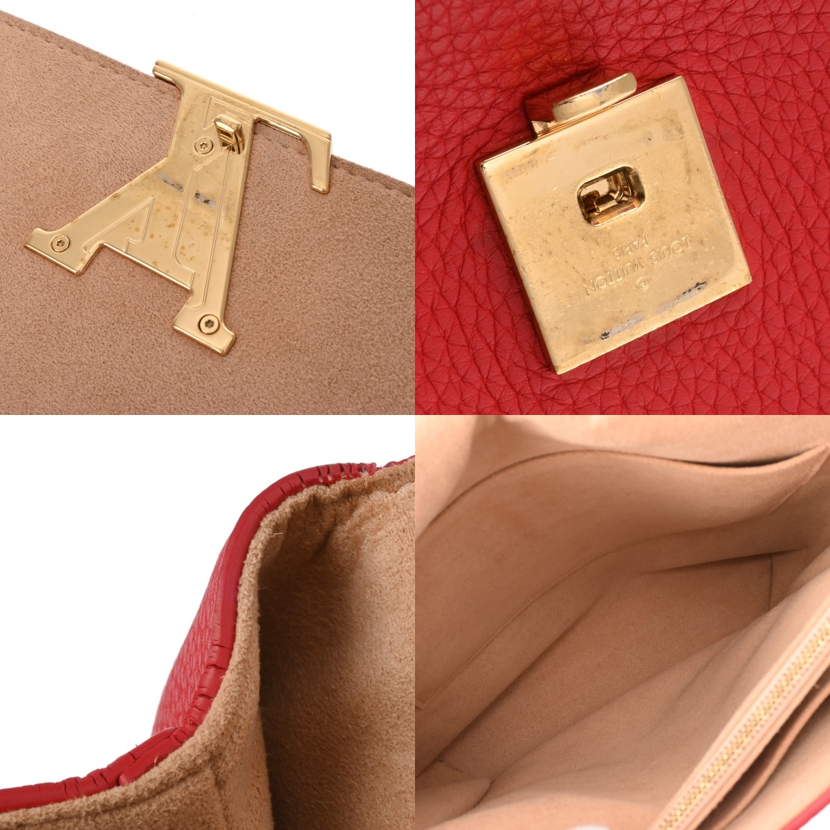 - フラップ裏に毛羽立ち、スレ、シワ、押し跡、毛羽立ち、ポケットに広がり、金具に色ハゲ、スリキズなど少々使用感がございます。