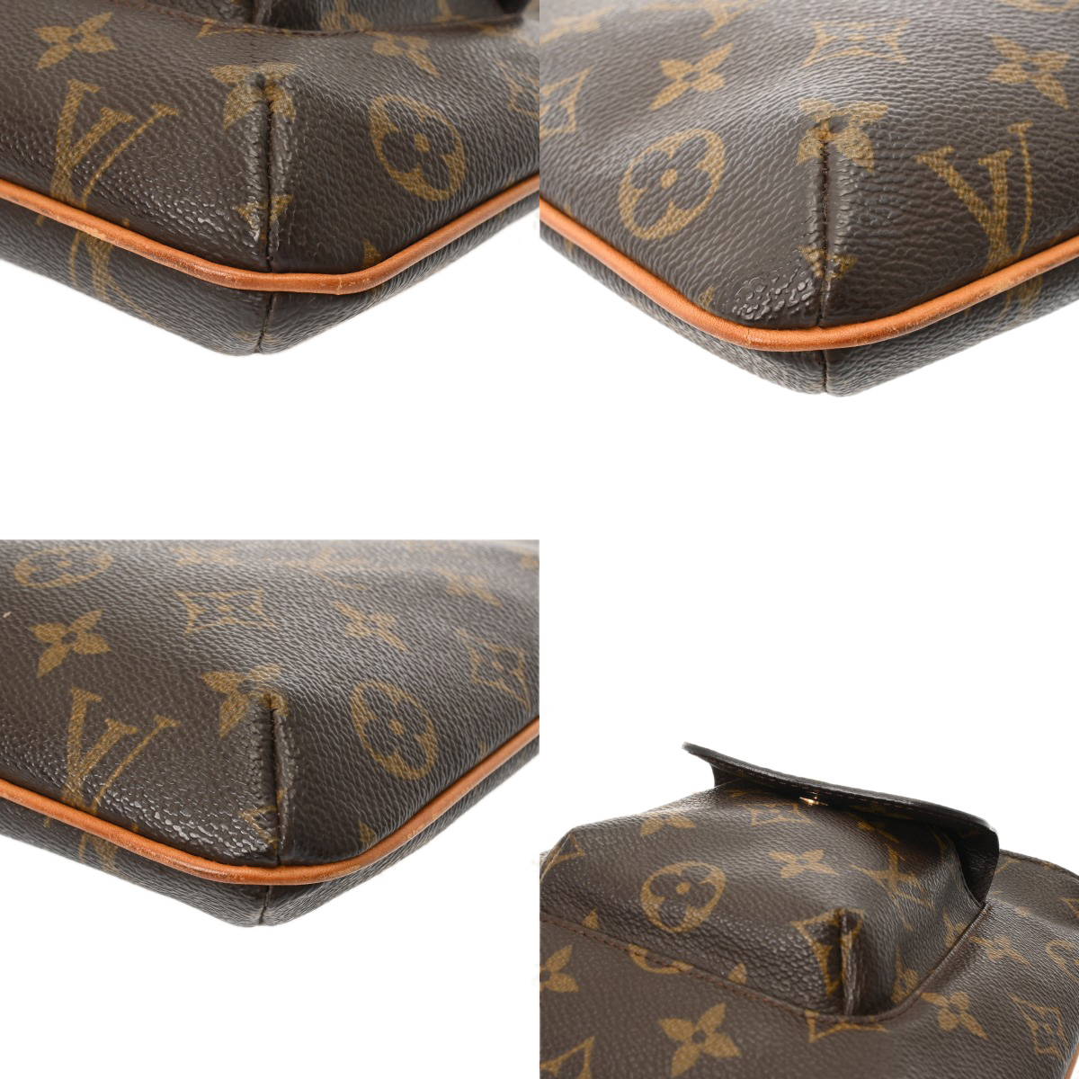 つぶれやテカリ、若干べたつき、薄汚れやスレ、ハンドストラップ含めヌメ革部分にヤケやスレ、金具部分にスリキズなど使用感がございます。