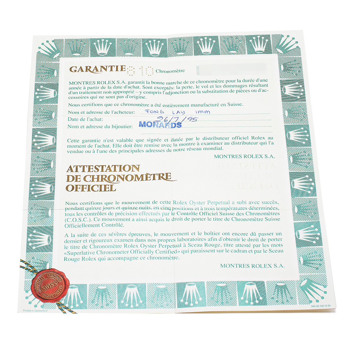 - メーカー保証書(1995年7月海外購入) 内箱(ダメージ)