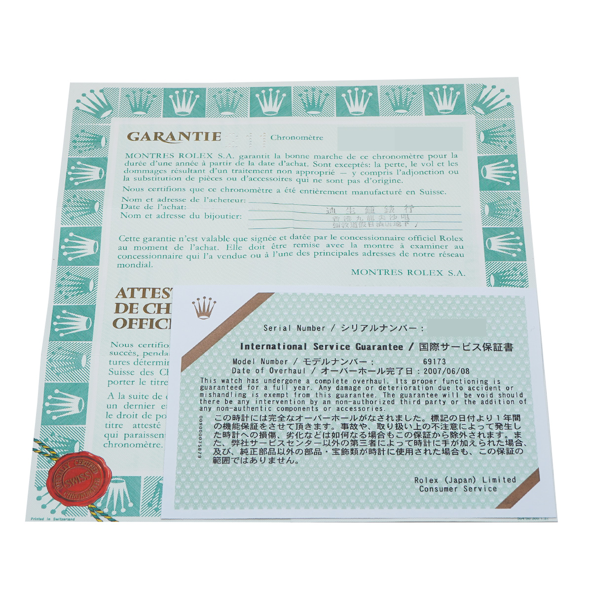 - メーカー保証書( 海外購入 購入日無記入) / 国際サービス保証書(2007年6月オーバーホール)