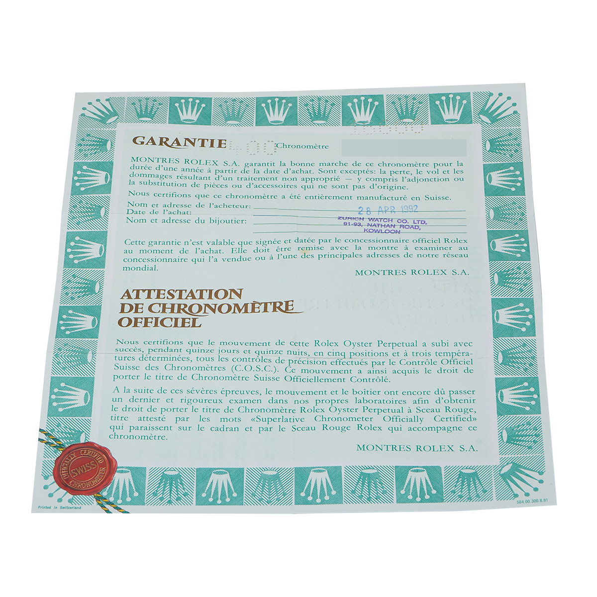 - メーカー保証書( 1992年4月海外購入) タグ