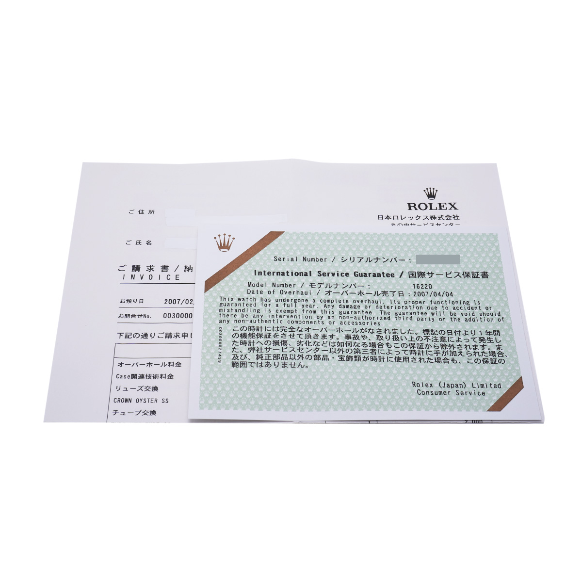 - 国際サービス保証書(2007年4月オーバーホール他)