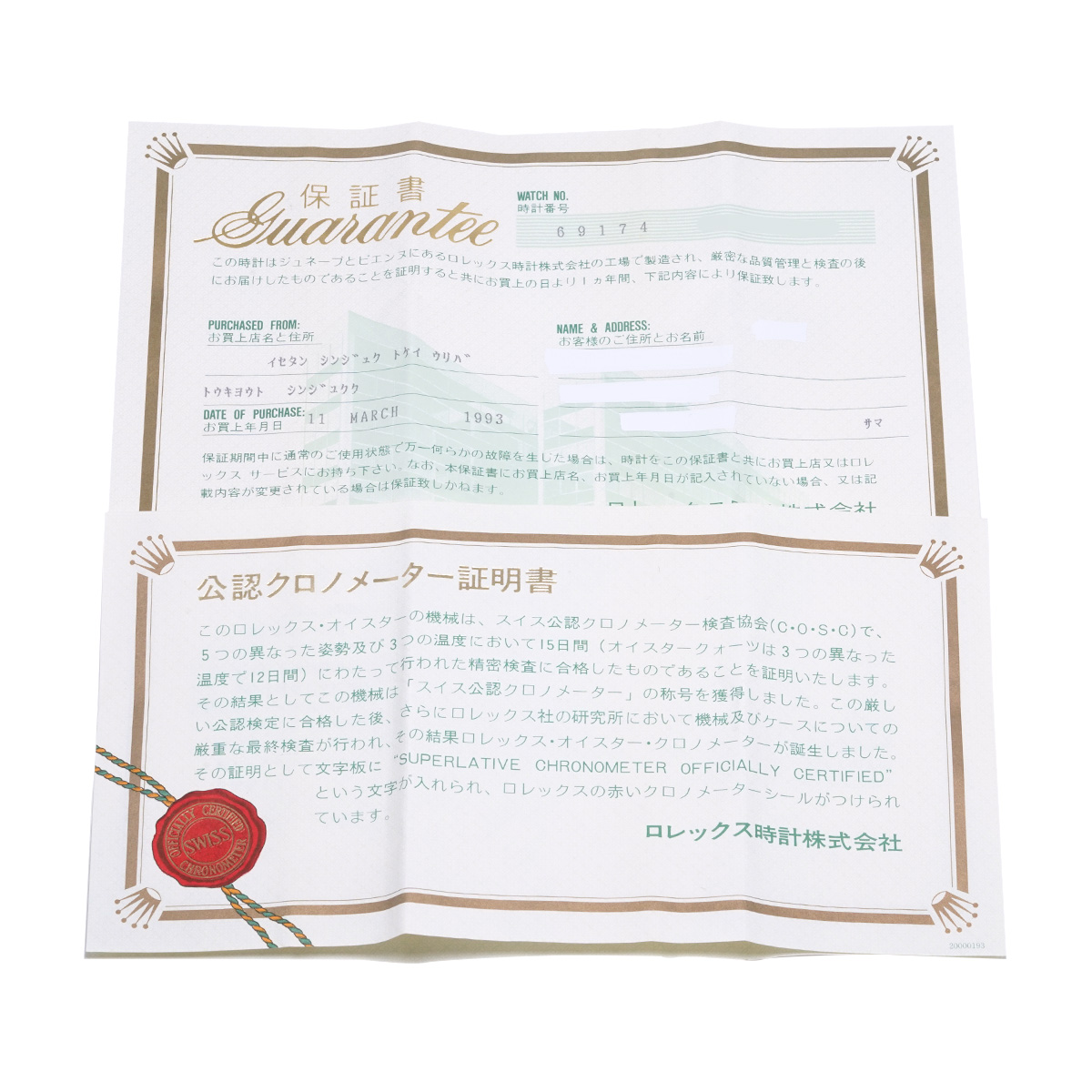 - メーカー保証書( 1993年3月国内購入) / 内箱(ダメージ)/クロノメーター証明書