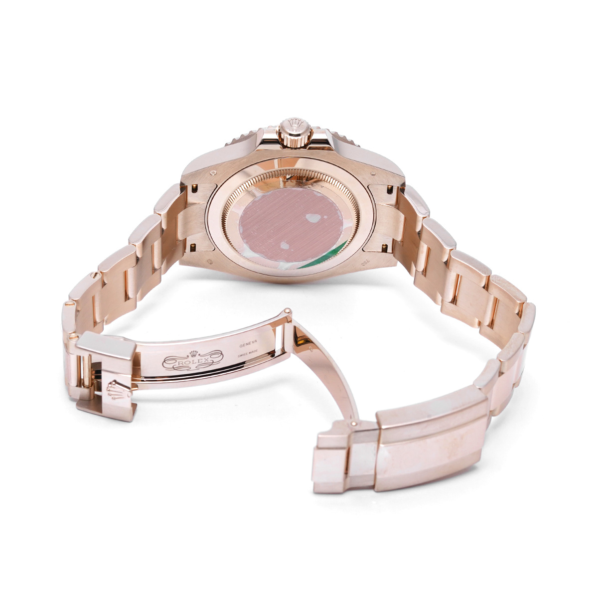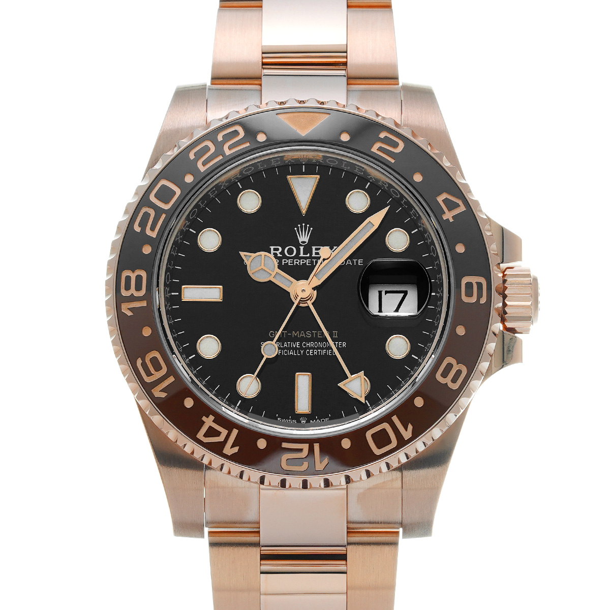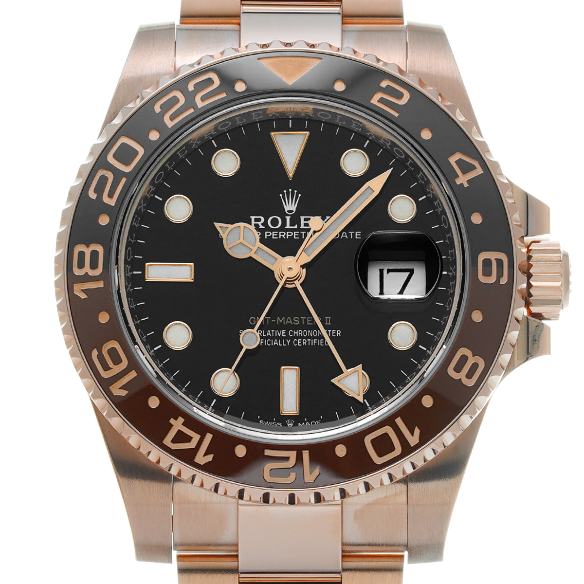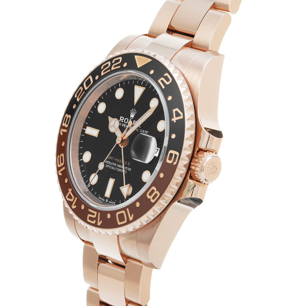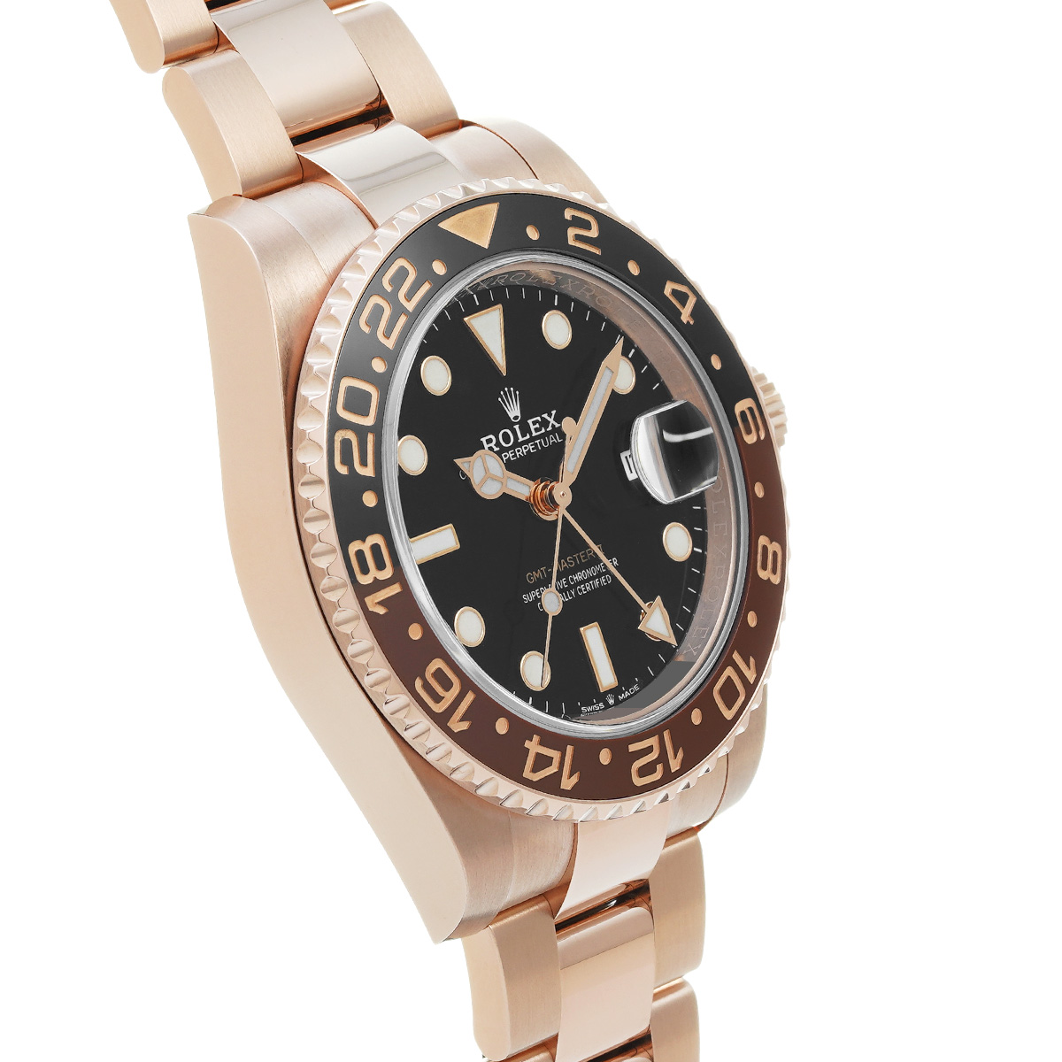 こちらはGMTマスターとして初めてエバーローズゴールド製のケースとブレスレットを採用したモデル。