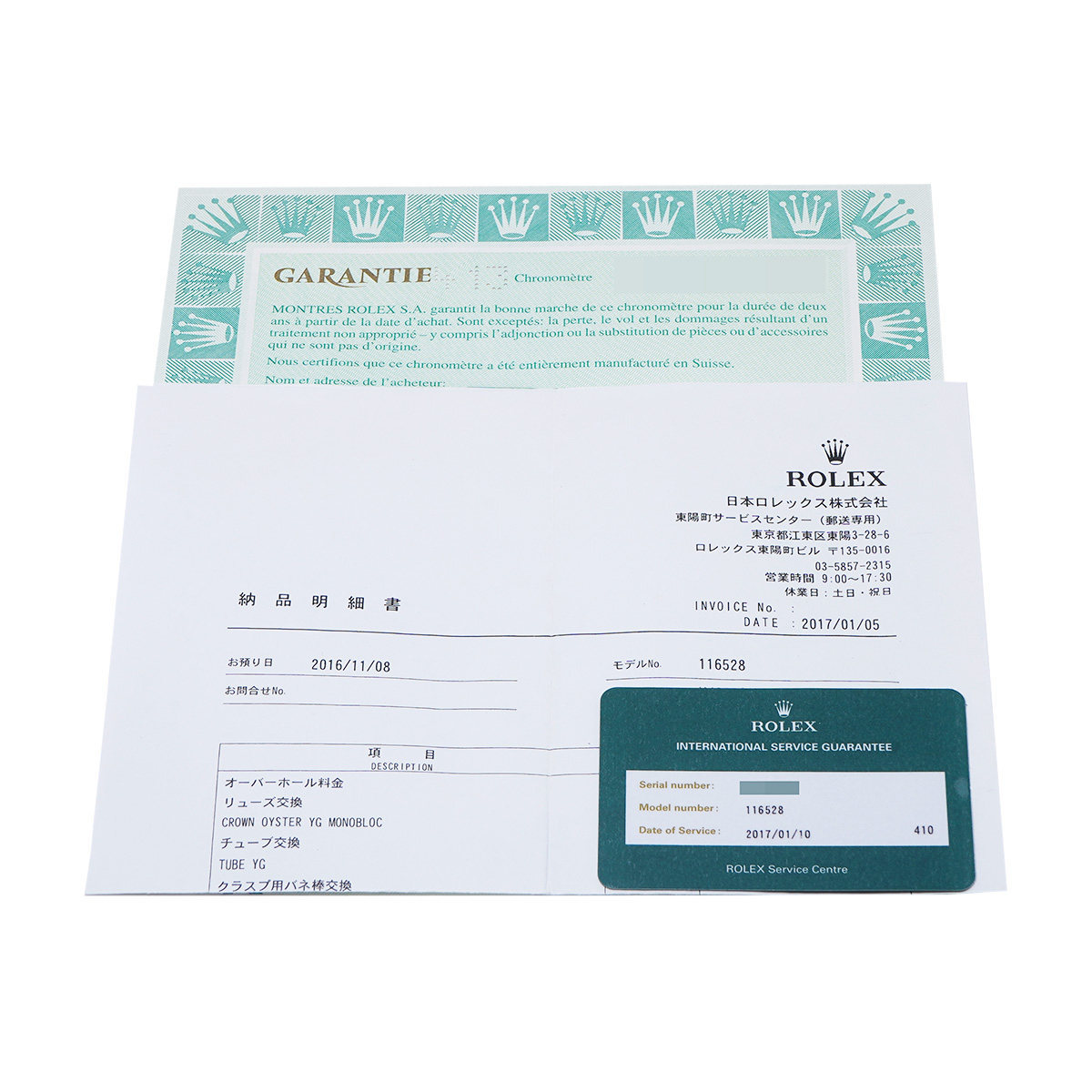 - メーカー保証書( 海外購入 購入日無記入) / 納品明細書/国際サービス保証書(2017年1月オーバーホール他)