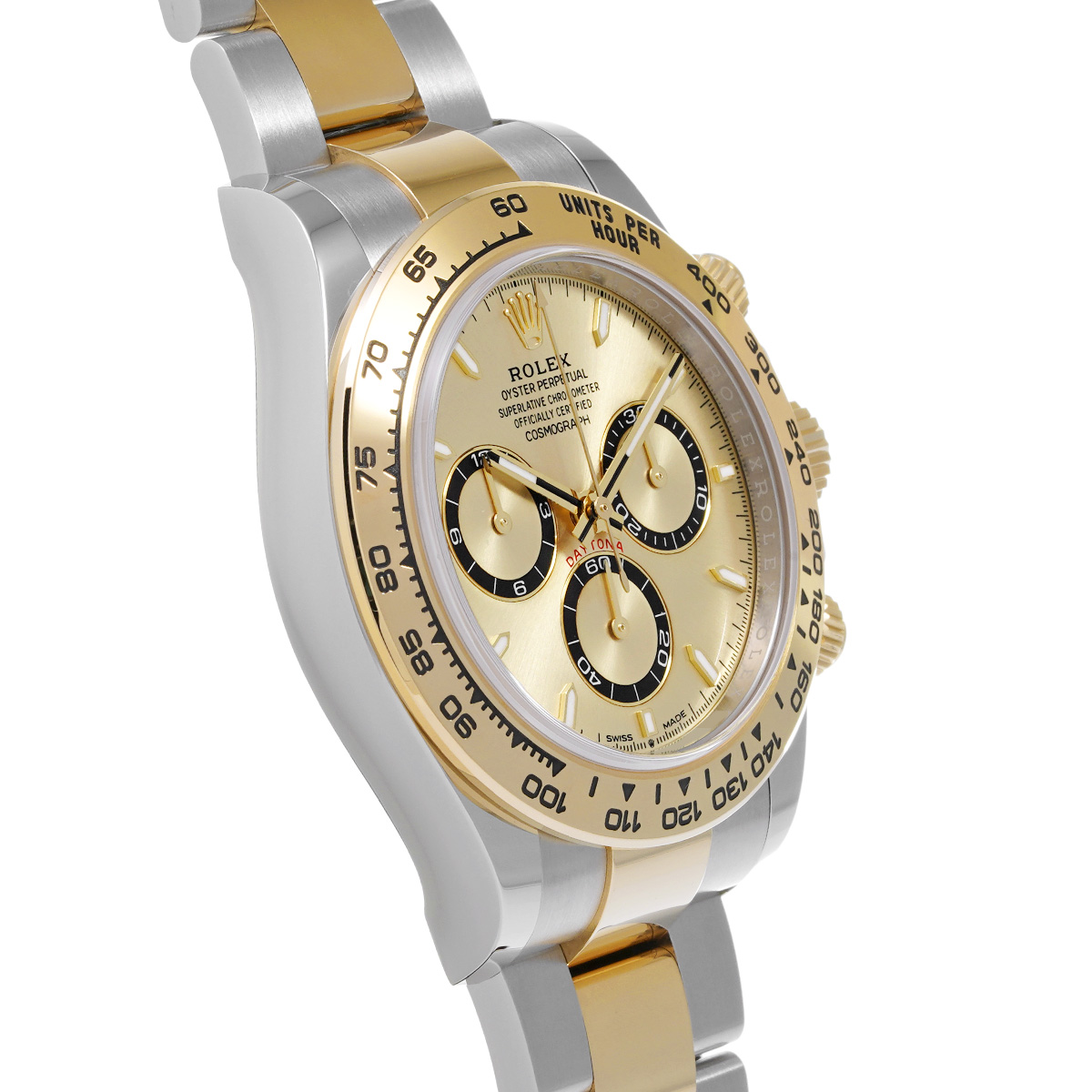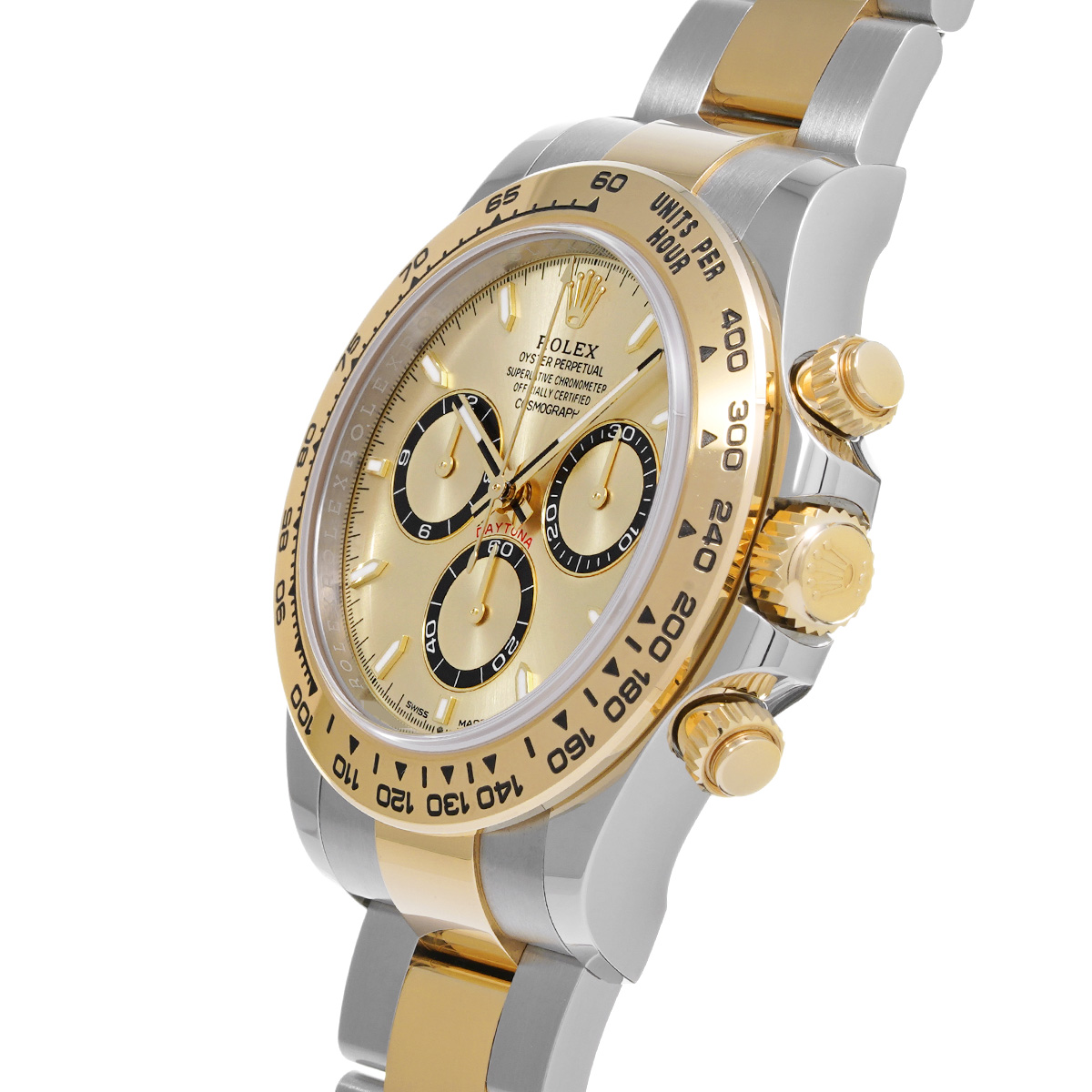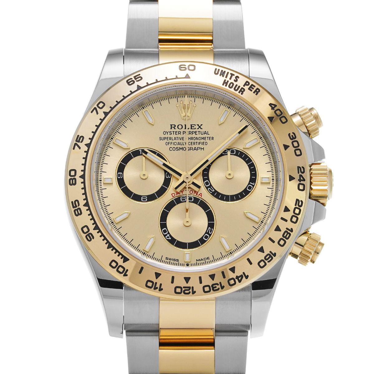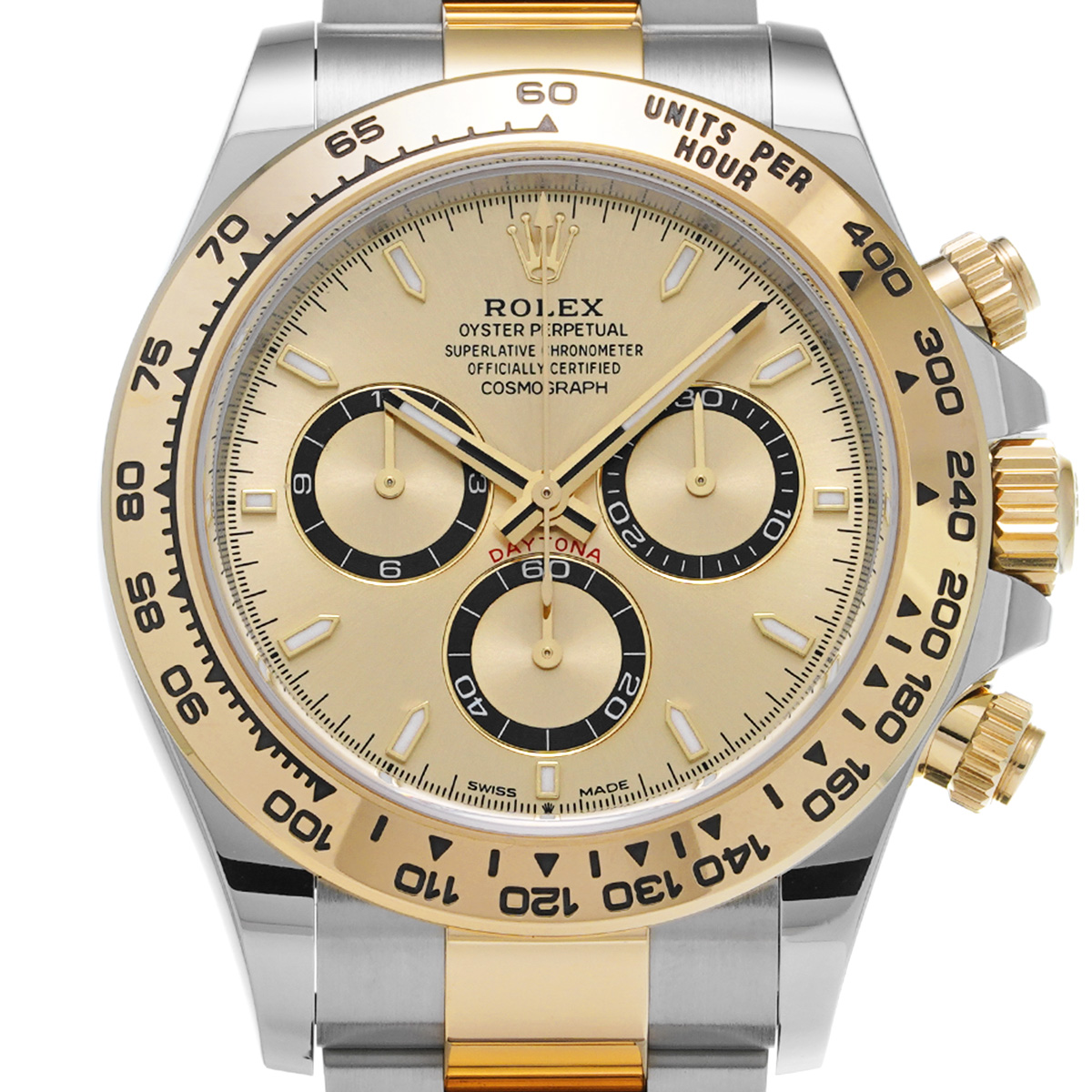 コメント現代最高の機械式クロノグラフのひとつ、コスモグラフ デイトナの、スチールとイエローゴールドのコンビ(=イエローロレゾール)の外装を持つモデルです。