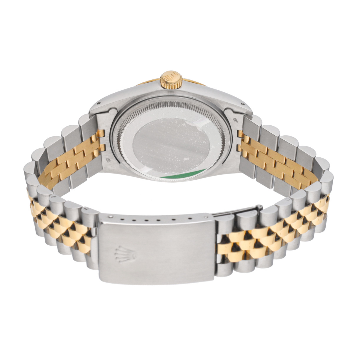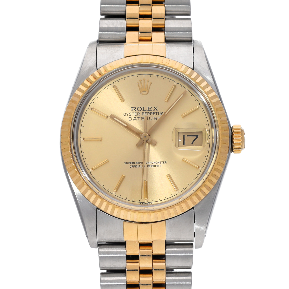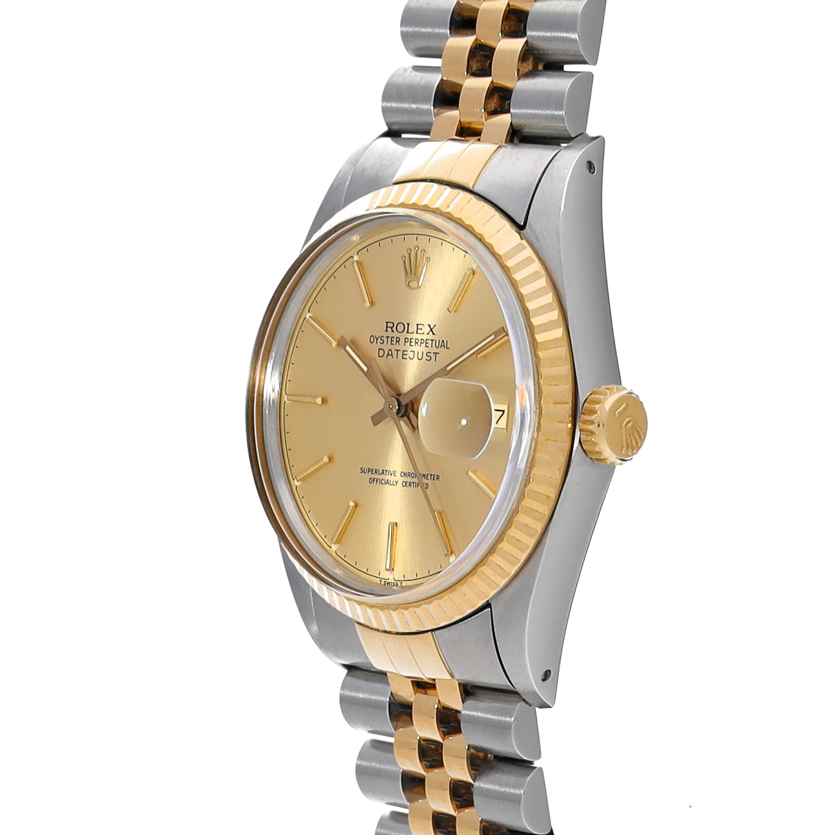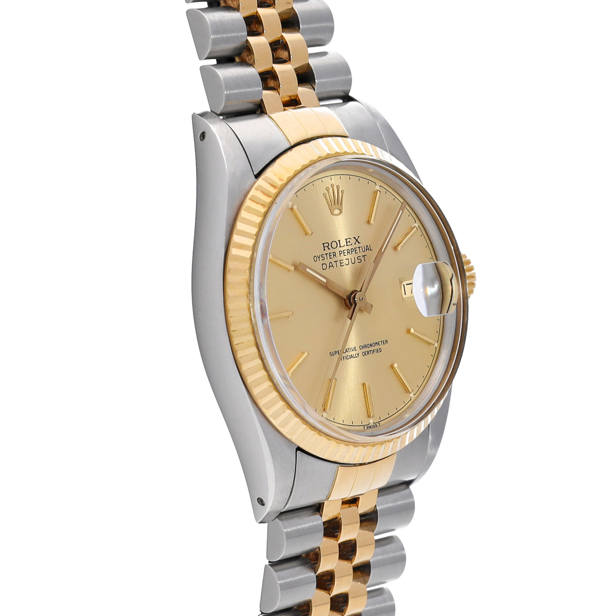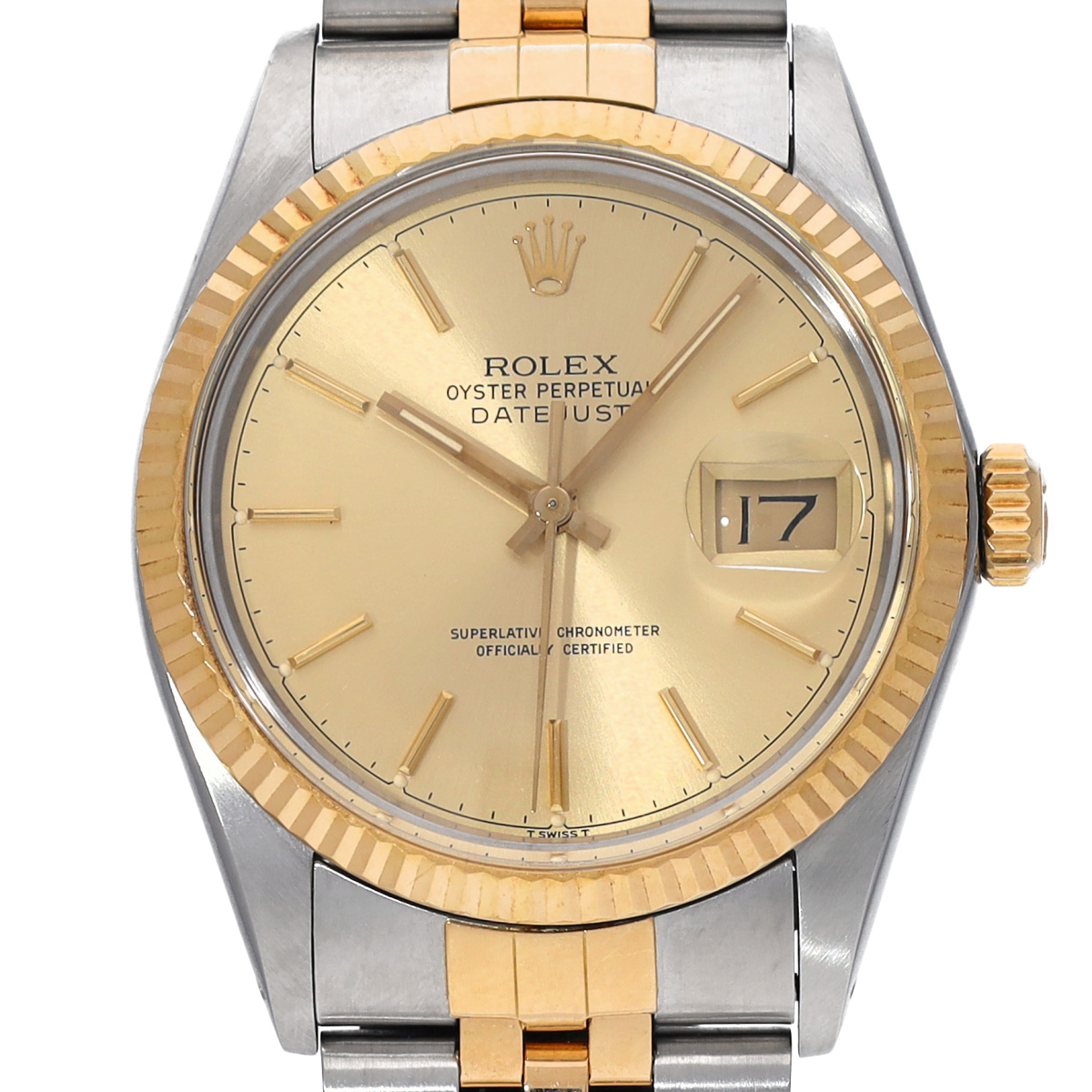 イエローロレゾール(ステンレススチールとイエローゴールドのコンビ)の外装にシャンパンダイアルをフィットした、代表的なデザインの一本ですが、文字盤から浮いているかのようなバーインデックスやその当時ならではのチャプターリングなどがプラスチック風防ごしにに製造されたデイトジャスト。