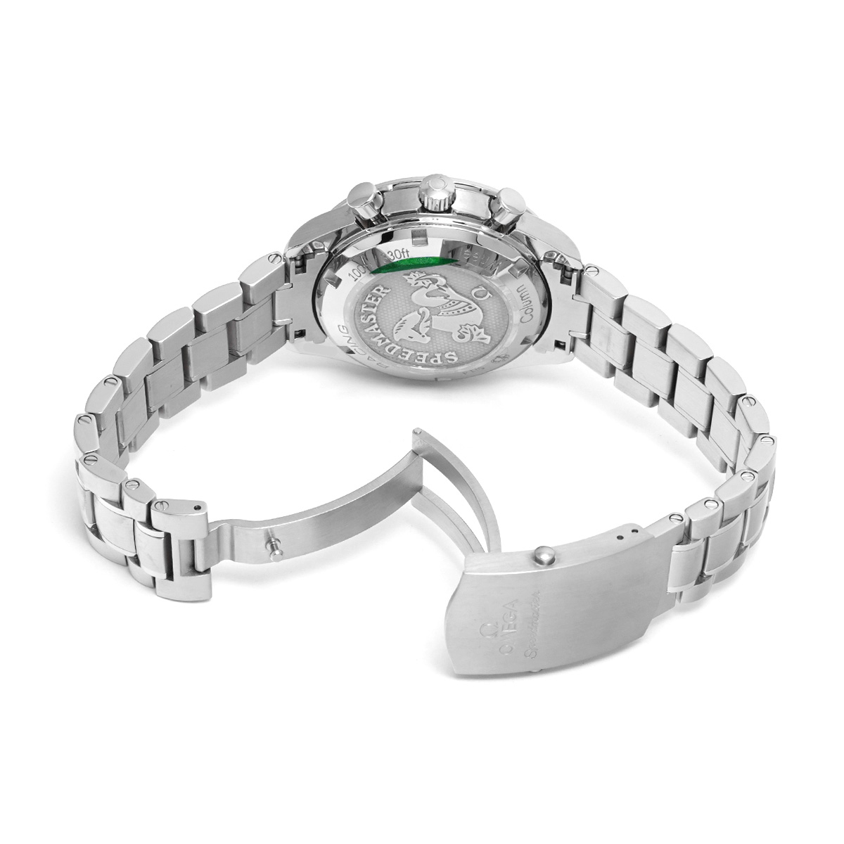 コメントケースを小径化して腕上での収まりの良さを改善すると共に、デイト表示付きの自動巻きムーブメントや100m防水などで、より日常使用に向くモデルとして仕立てた自動巻きのスピードマスターは、歴代モデルのすべてが大変に人気の高いものになっていますが、こちらは2012年にコーアクシャル脱進機とコラムホイール式のクロノグラフ機構を搭載して大幅にグレードアップしたレーシングです。