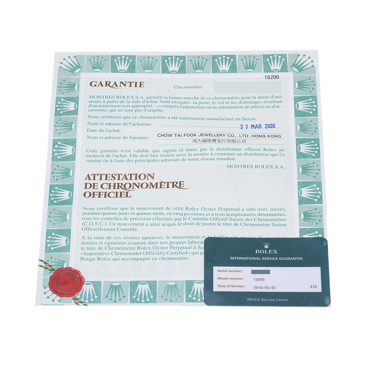 - メーカー保証書( 2000年3月海外購入) / メーカー箱(ダメージ)/冊子 / 国際サービス保証書(2018年5月オーバーホール)
