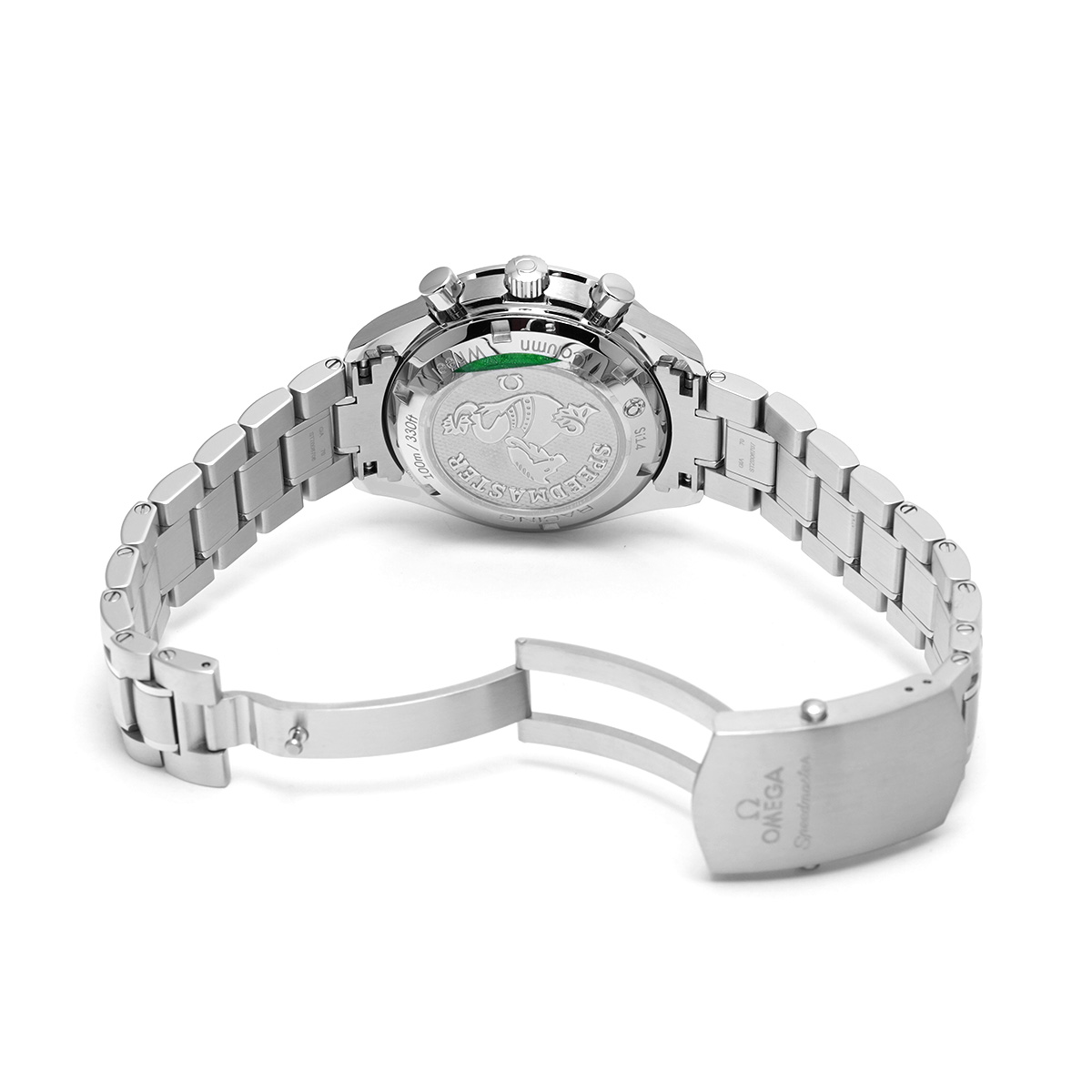 コメントケースを小径化して腕上での収まりの良さを改善すると共に、デイト表示付きの自動巻きムーブメントや100m防水などで、より日常使用に向くモデルとして仕立てた自動巻きのスピードマスターは、歴代モデルのすべてが大変に人気の高いものになっていますが、こちらは2012年にコーアクシャル脱進機とコラムホイール式のクロノグラフ機構を搭載して大幅にグレードアップしたレーシングです。