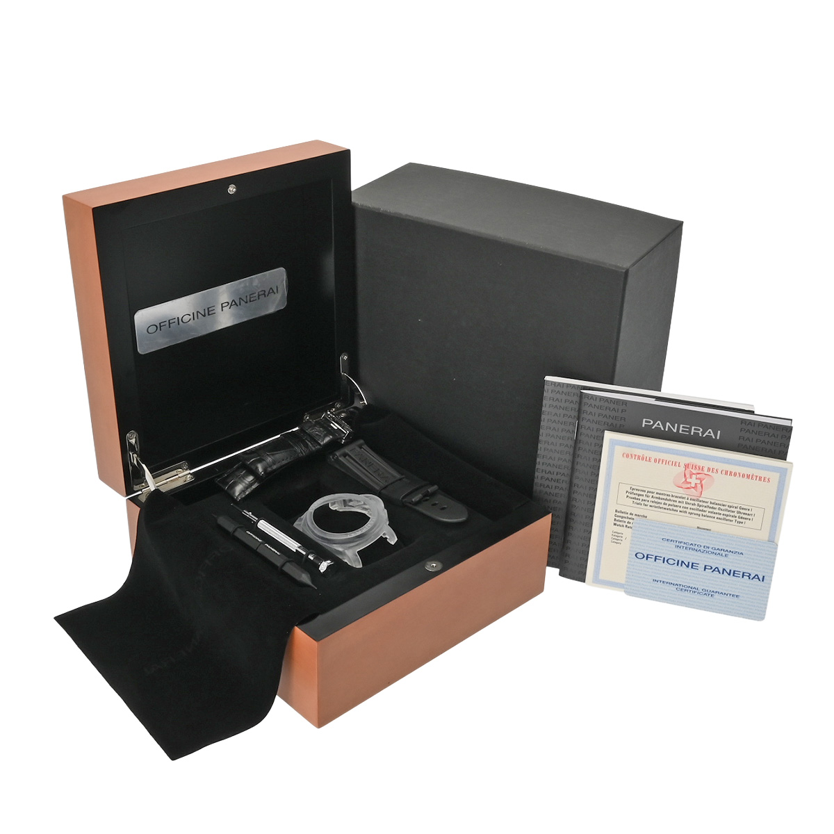 - メーカー保証書( 海外購入 購入日無記入) 替えベルト( アリゲーター/ブラック/やや使用感有、ラバー/ブラック) メーカー箱(劣化) 冊子 クロノメーター証明書