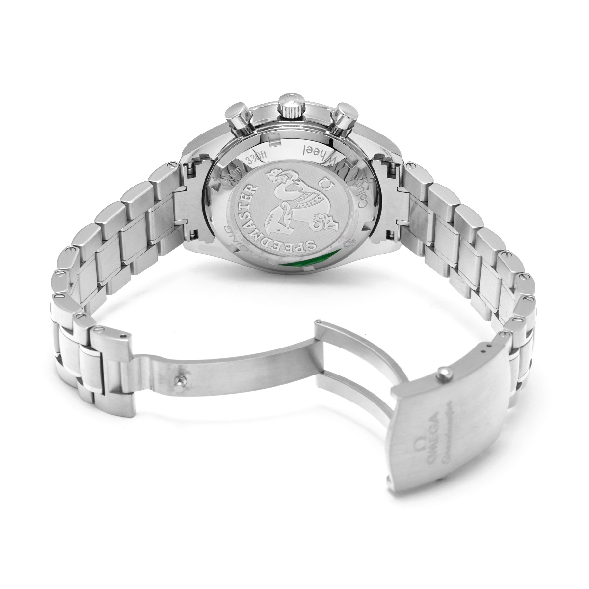 コメントケースを小径化して腕上での収まりの良さを改善すると共に、デイト表示付きの自動巻きムーブメントや100m防水などで、より日常使用に向くモデルとして仕立てた自動巻きのスピードマスターは、歴代モデルのすべてが大変に人気の高いものになっていますが、こちらは2012年にコーアクシャル脱進機とコラムホイール式のクロノグラフ機構を搭載して大幅にグレードアップしたレーシングです。