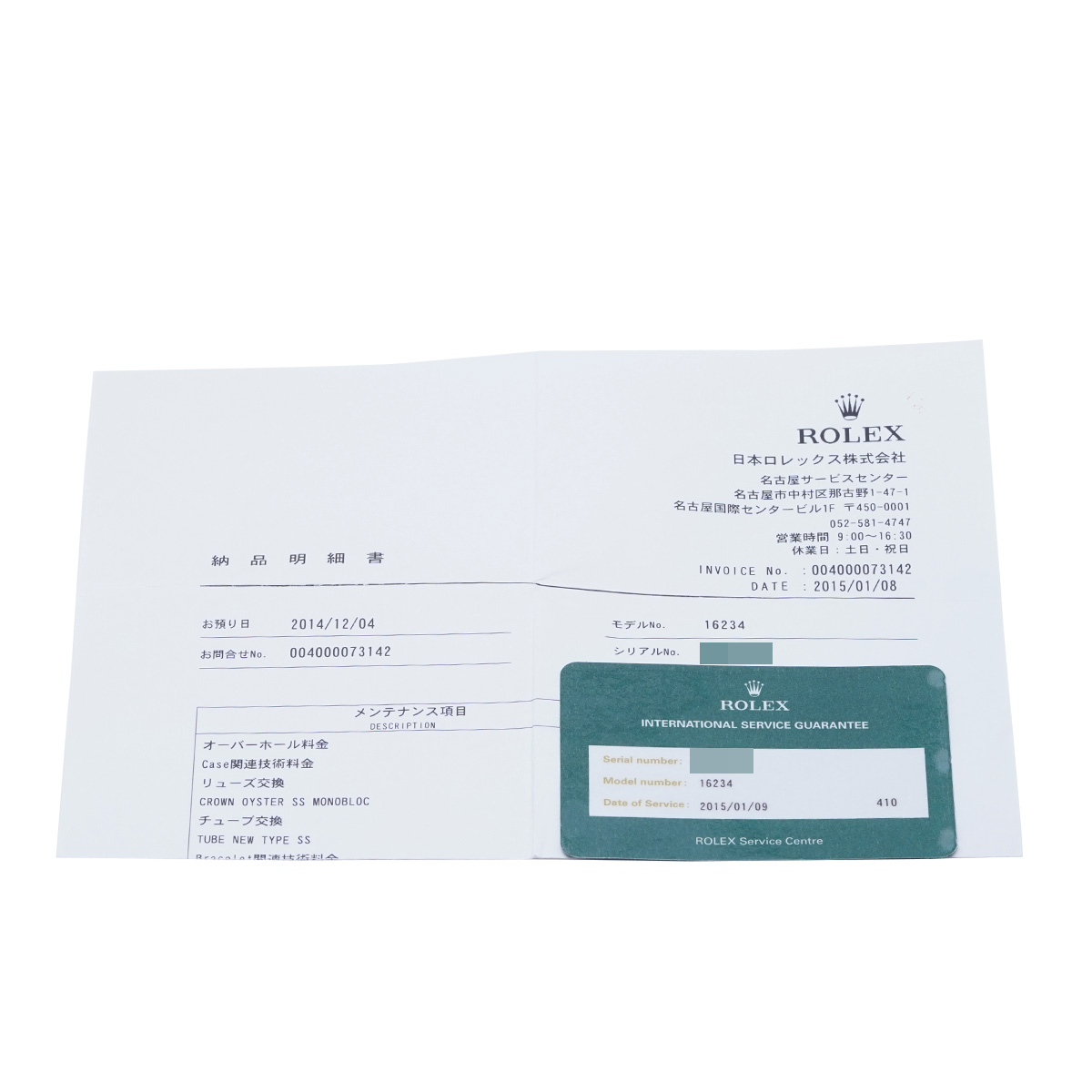 - 納品明細書/国際サービス保証書(2015年1月オーバーホール他)