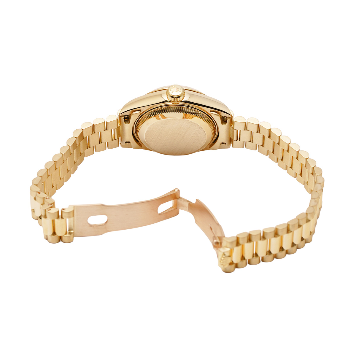 それから四半世紀の歳月を経て進化したこの世代のレディ デイトジャストの中でも、このゴールドモデルはもちろん特別な存在であり、最高峰の証であるプレジデントブレスレットがフィットされているほか、様々なジュエリーピースのベースモデルとして多く用いられています。 -