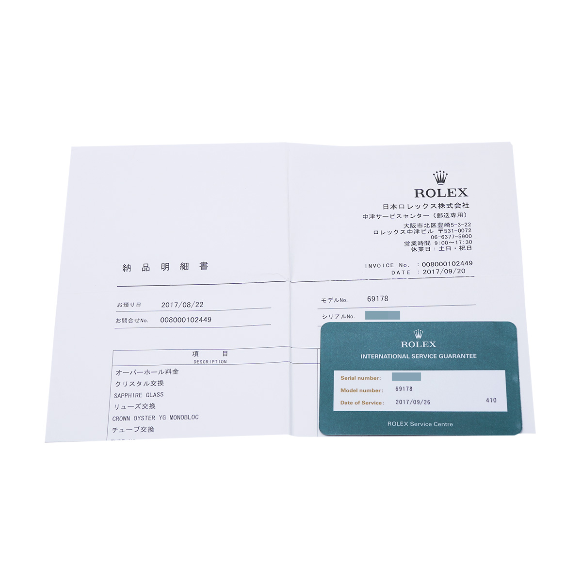 - 国際サービス保証書/納品明細書(2017年9月オーバーホール他)