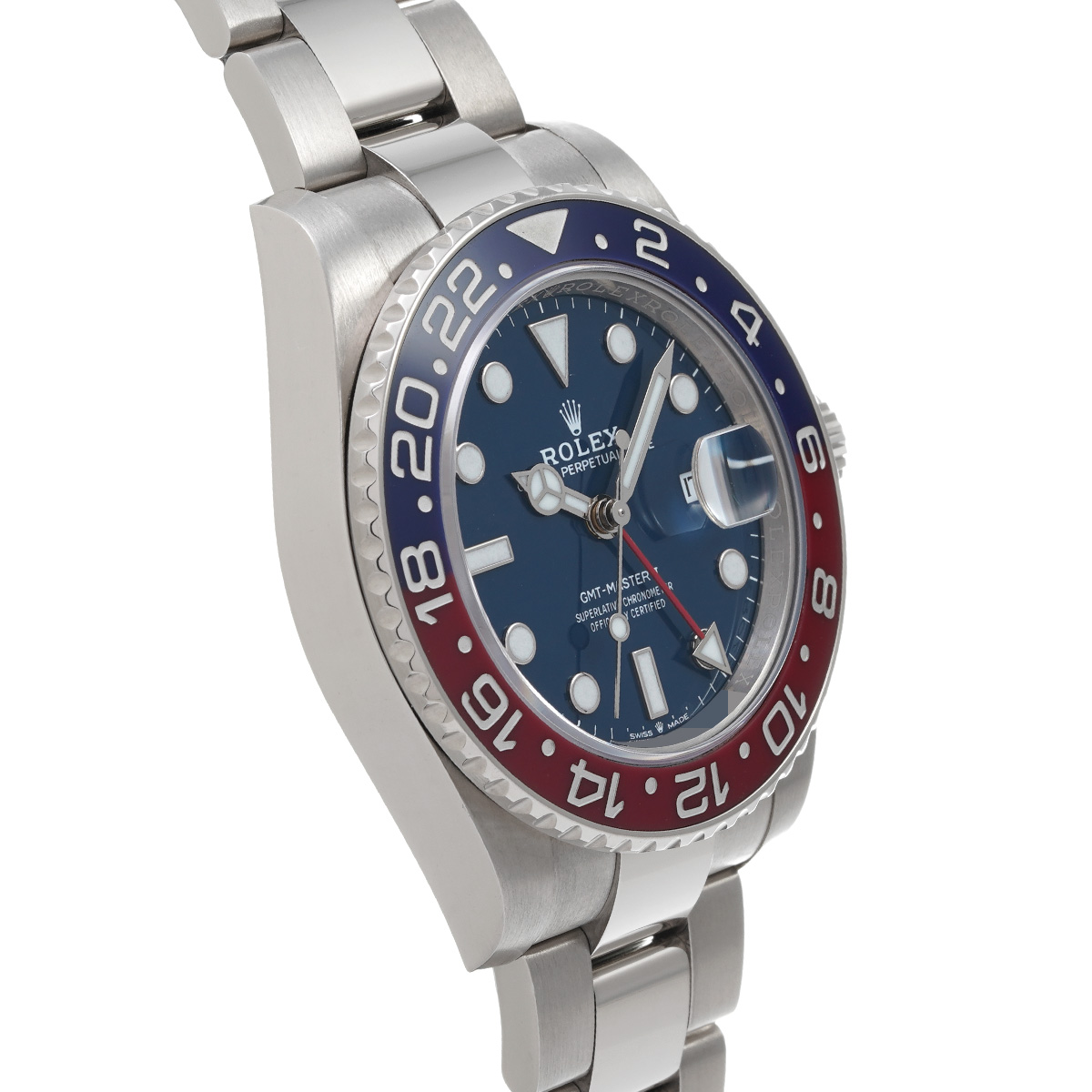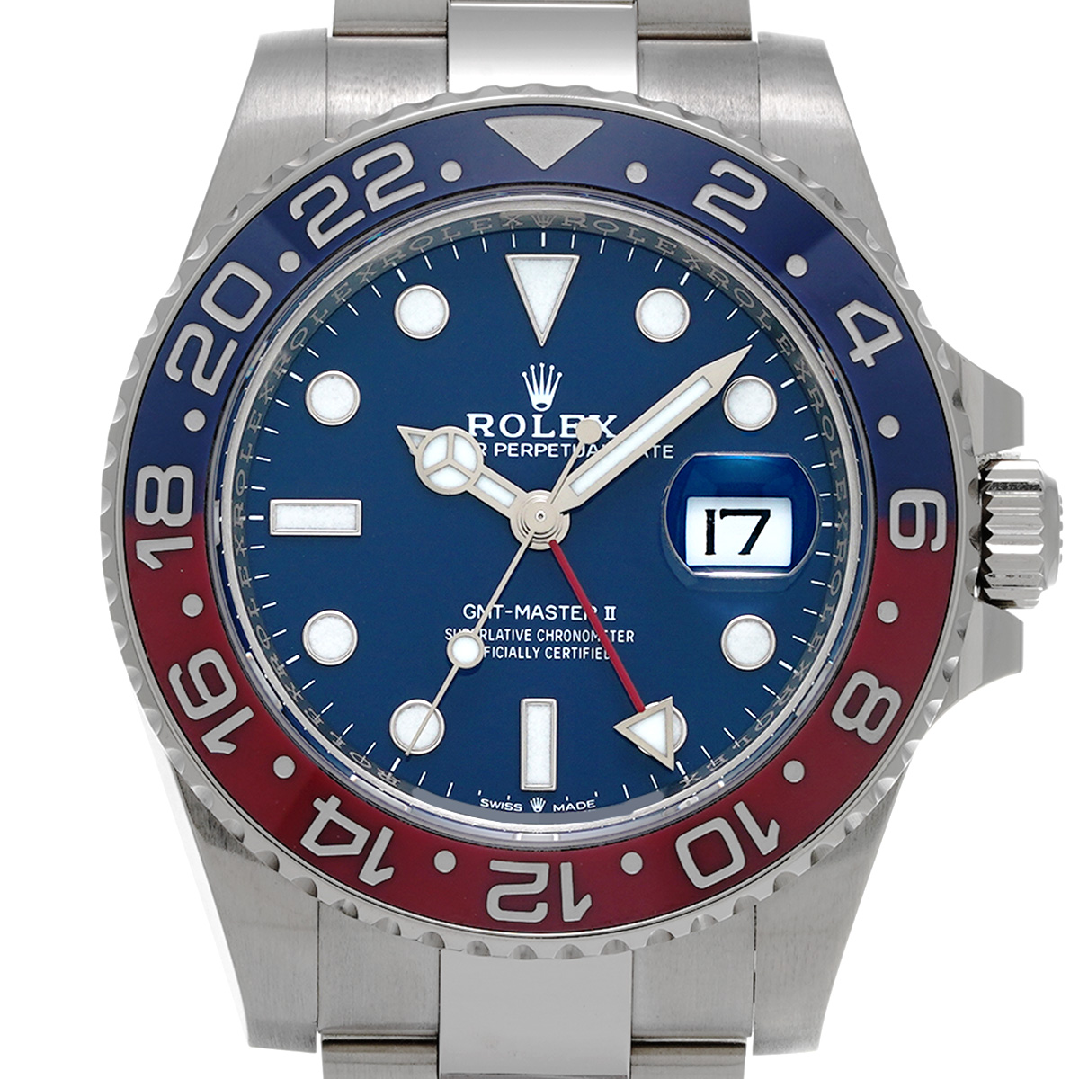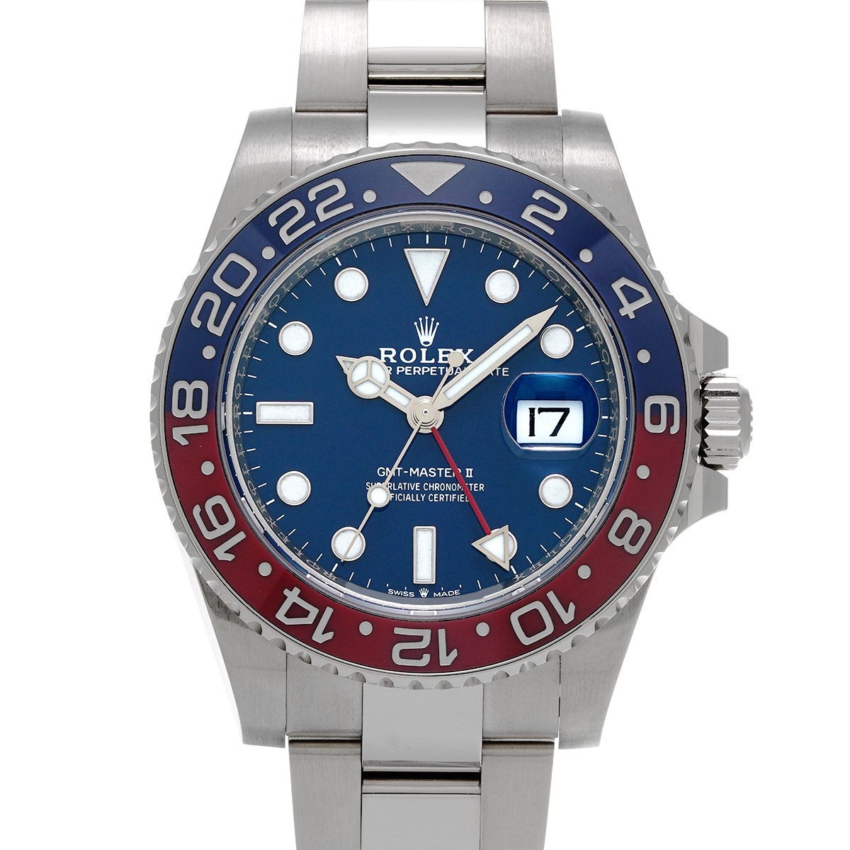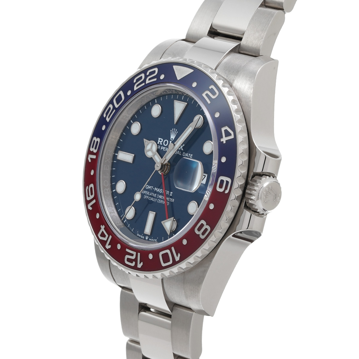 こちらはホワイトゴールドのケースとブレスレットに、伝統的な赤と青のツートンのベゼルを備えるバリエーション。