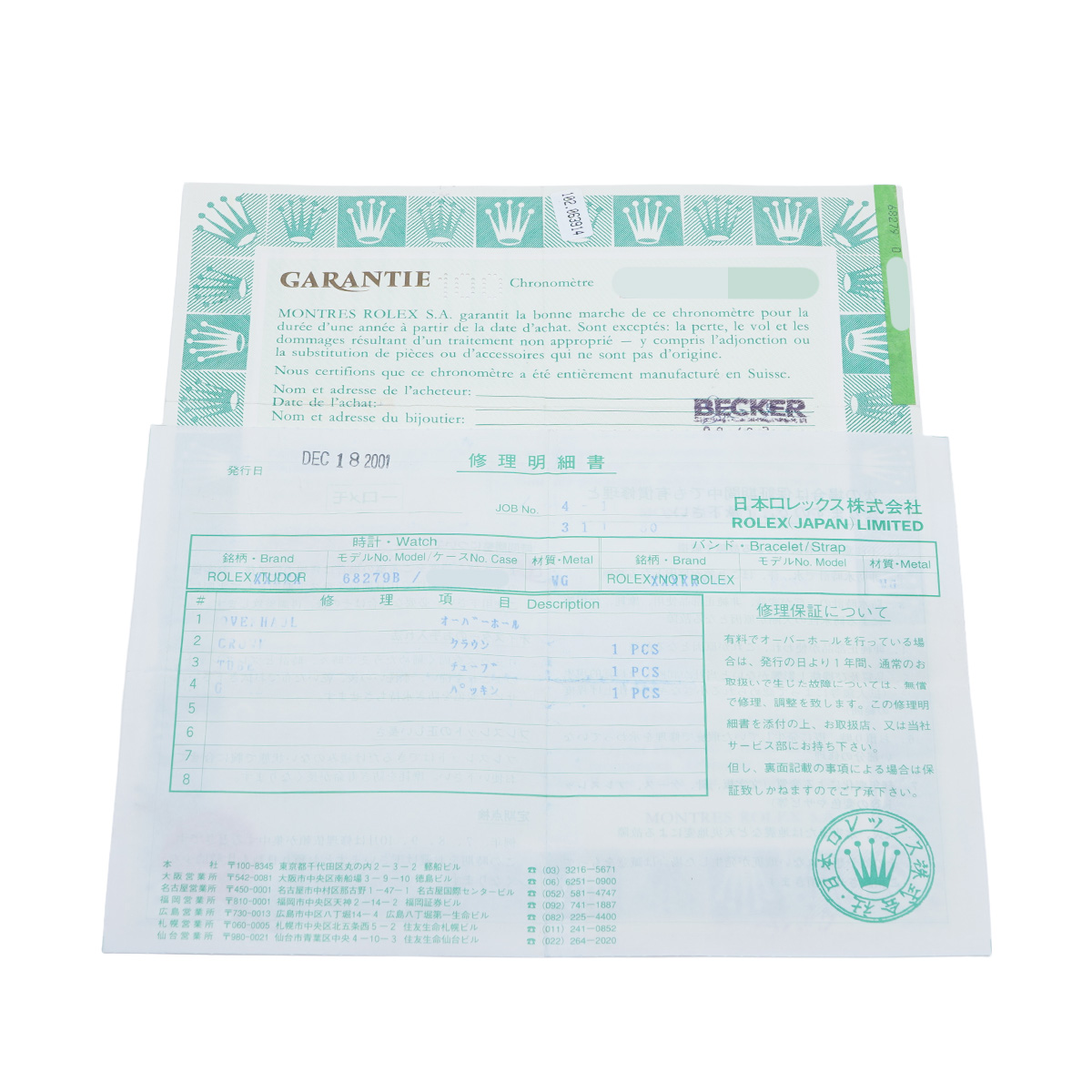 - メーカー保証書( 1992年9月海外購入) / メーカー箱(ダメージ)/タグ / 修理明細書(2001年12月オーバーホール) ※メーカー箱(ダメージ/破損有)