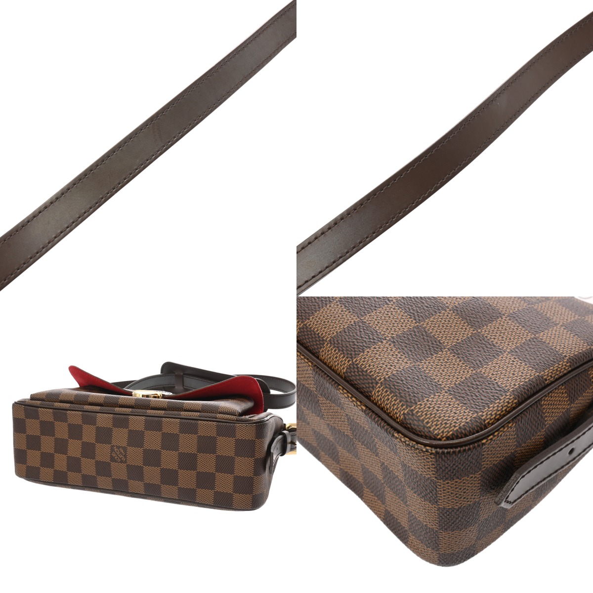 - つぶれ、薄汚れ、フラップに反り、付属ショートストラップ含めショルダーにクセ、シワ、ヤケ、金具にくすみやスリキズが若干ございます。