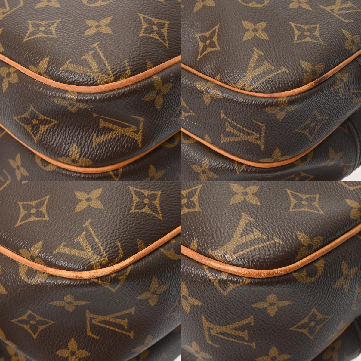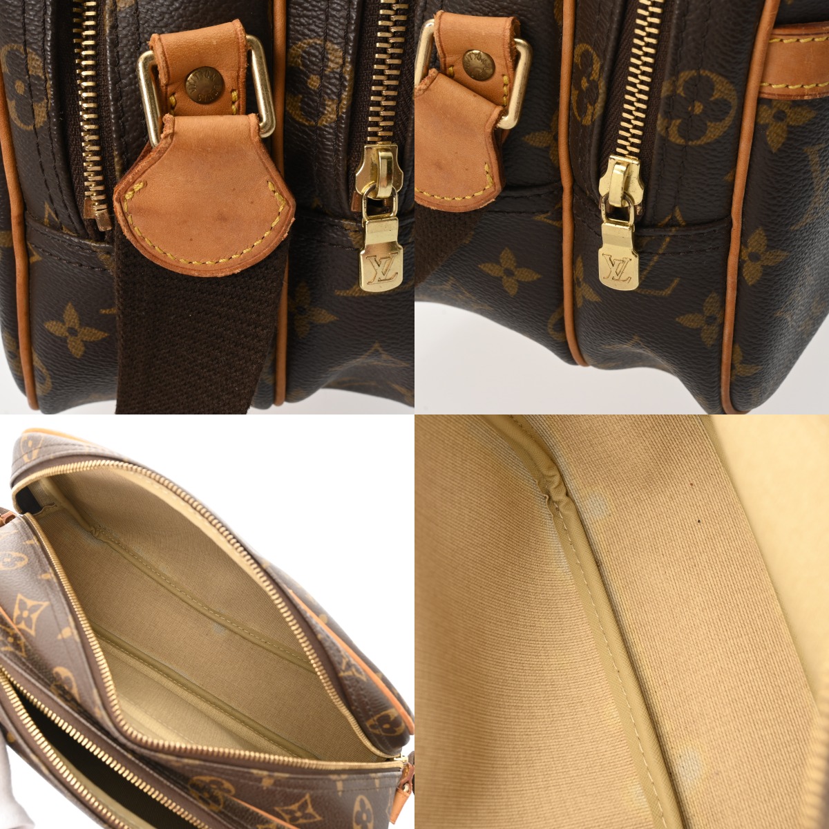 - つぶれ、薄汚れ、テカリ、スレ、ヌメ革部分にヤケやシミ、シワ、コバスレ、ショルダー部分に若干毛羽立ちやヨレ、金具部分に色ハゲやくすみ、スレキズなど使用感がございます。