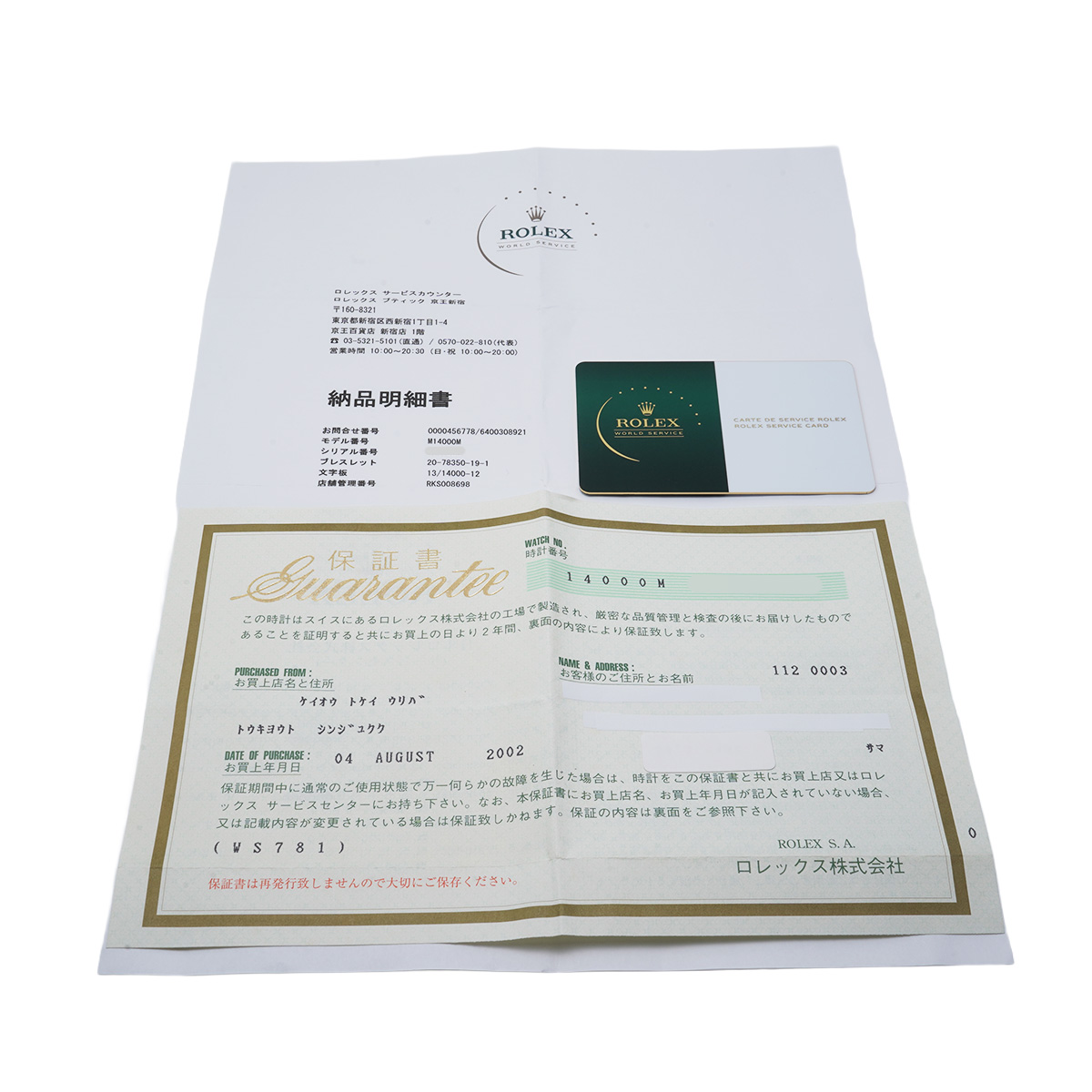 - メーカー保証書( 2002年8月国内購入) メーカー箱 タグ 修理明細書(2025年5月オーバーホール他) サービスカード(有効期限2027年5月)