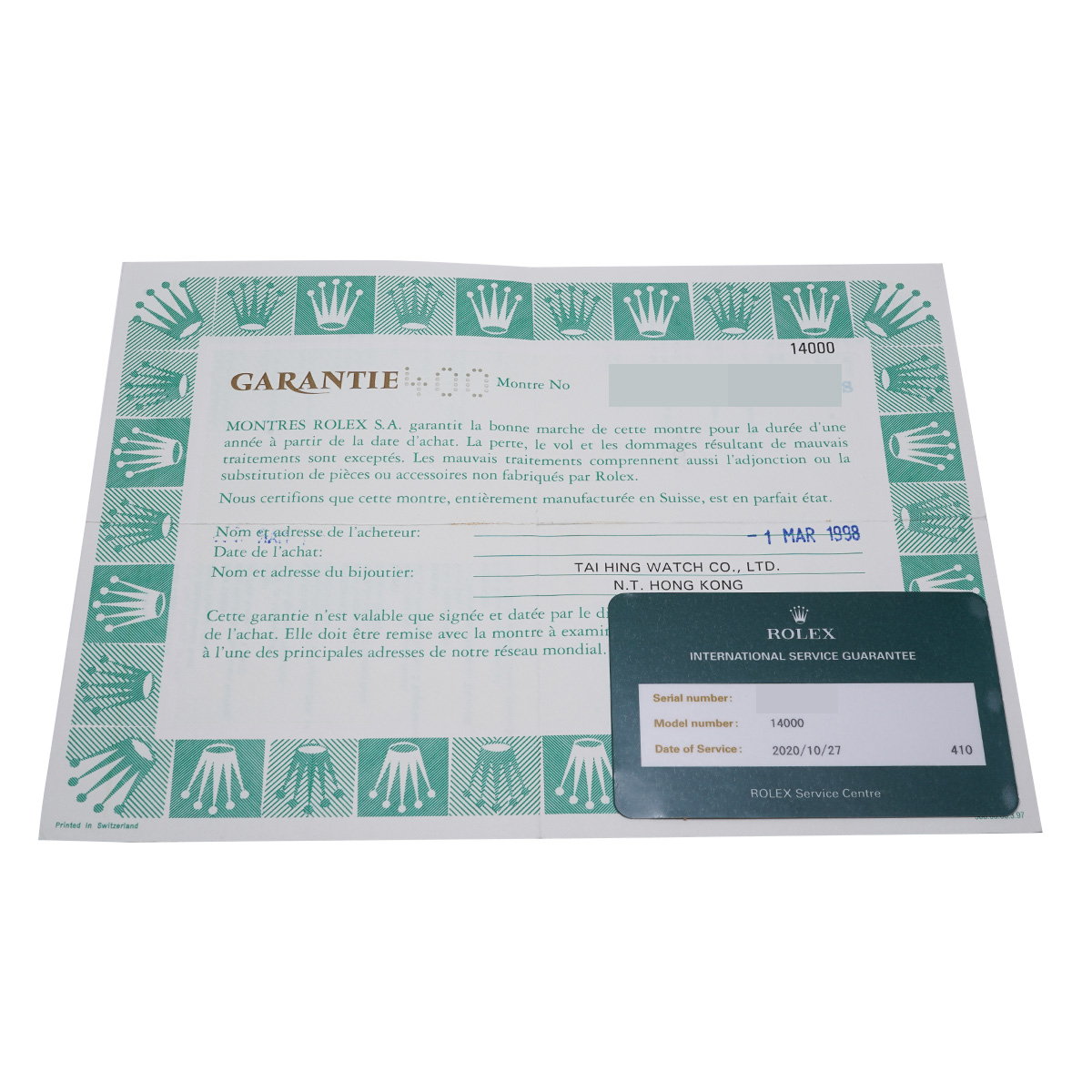 - メーカー保証書( 1998年3月海外購入) / メーカー箱(ダメージ) / 国際サービス保証書(2020年10月オーバーホール)