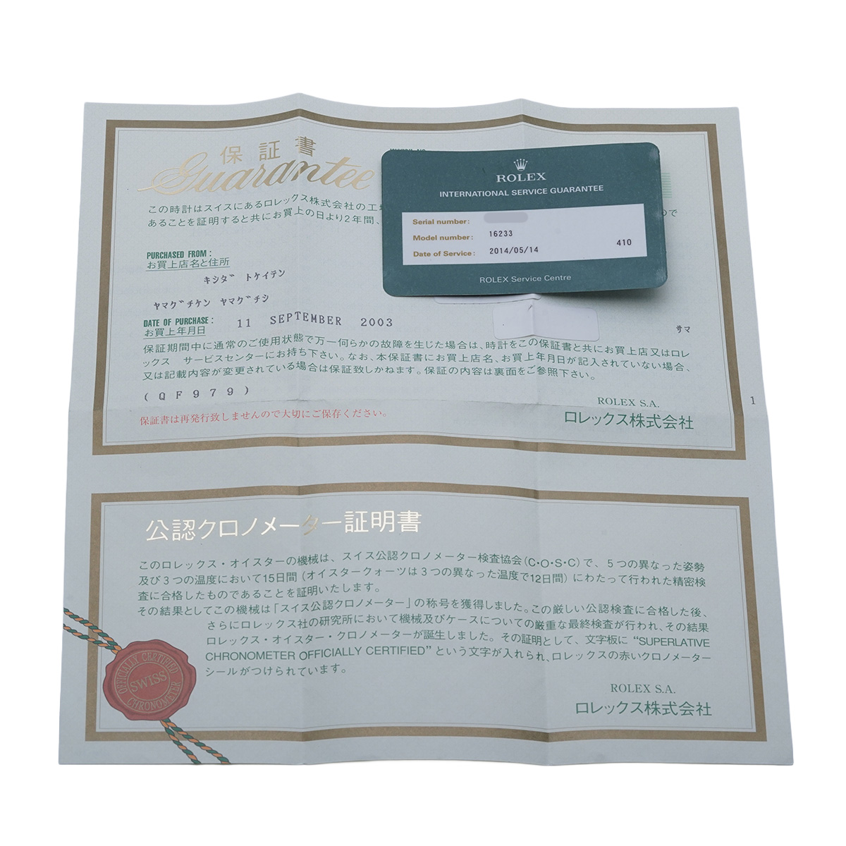 - メーカー保証書( 2003年9月国内購入) / 国際サービス保証書(2014年5月オーバーホール)