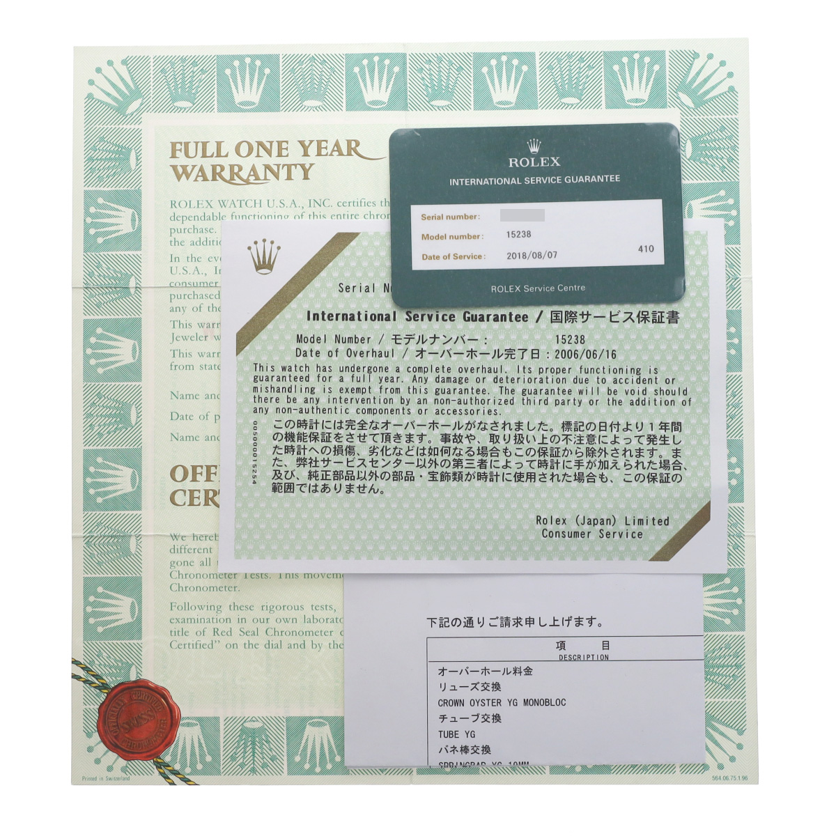 - メーカー保証書( 1997年6月海外購入) / メーカー箱(ダメージ)/タグ / 国際サービス保証書(2006年6月/2018年8月 オーバーホール)