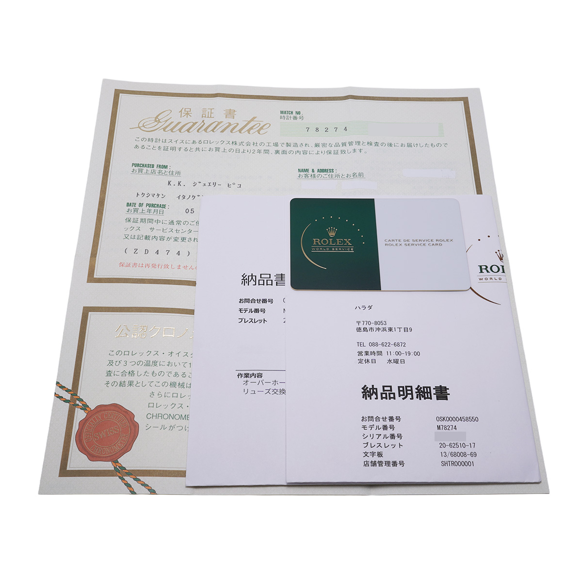 メーカー保証書( 2003年10月国内購入) / メーカー箱(ダメージ)/冊子 / ロレックスサービスカード、納品明細書(2024年2月オーバーホール)