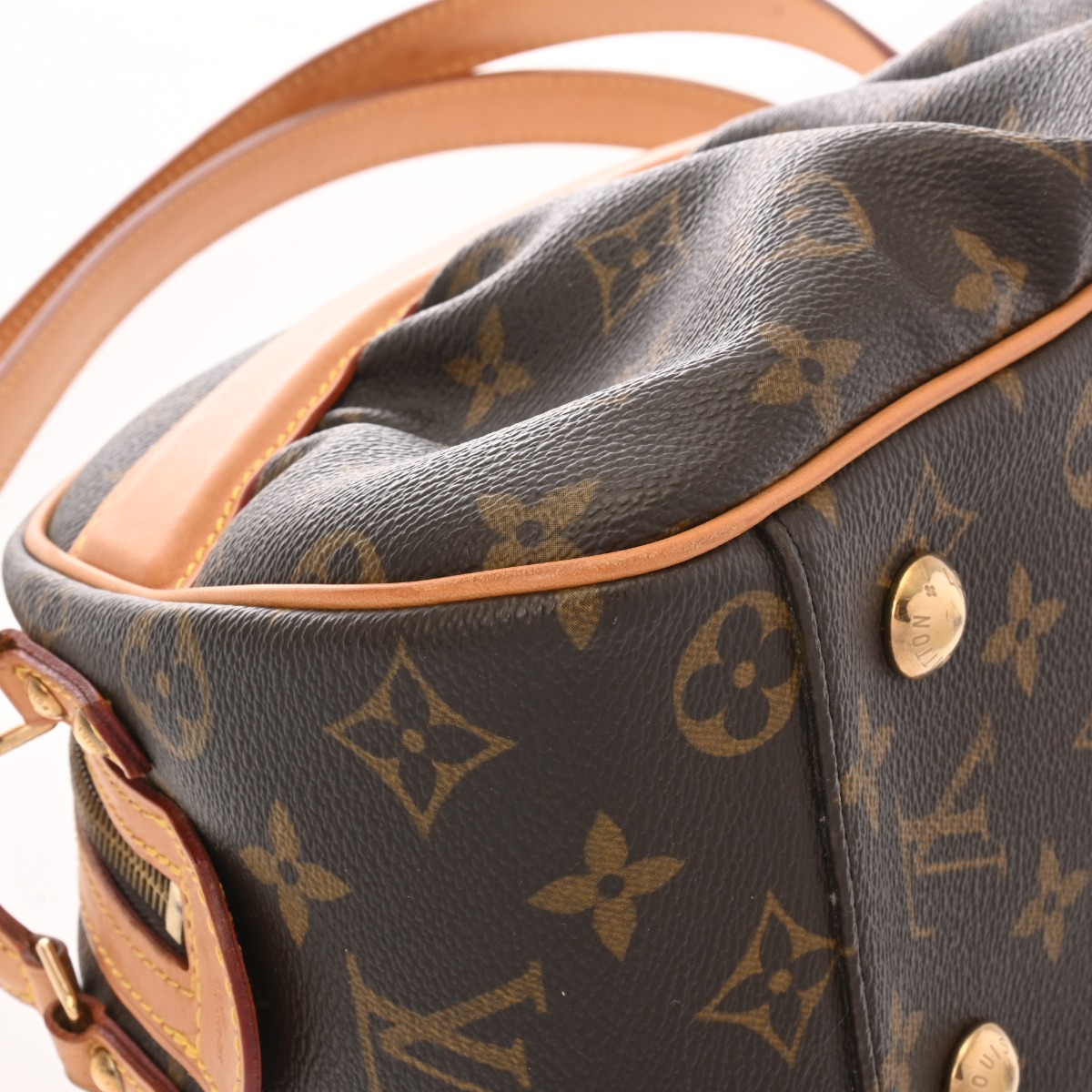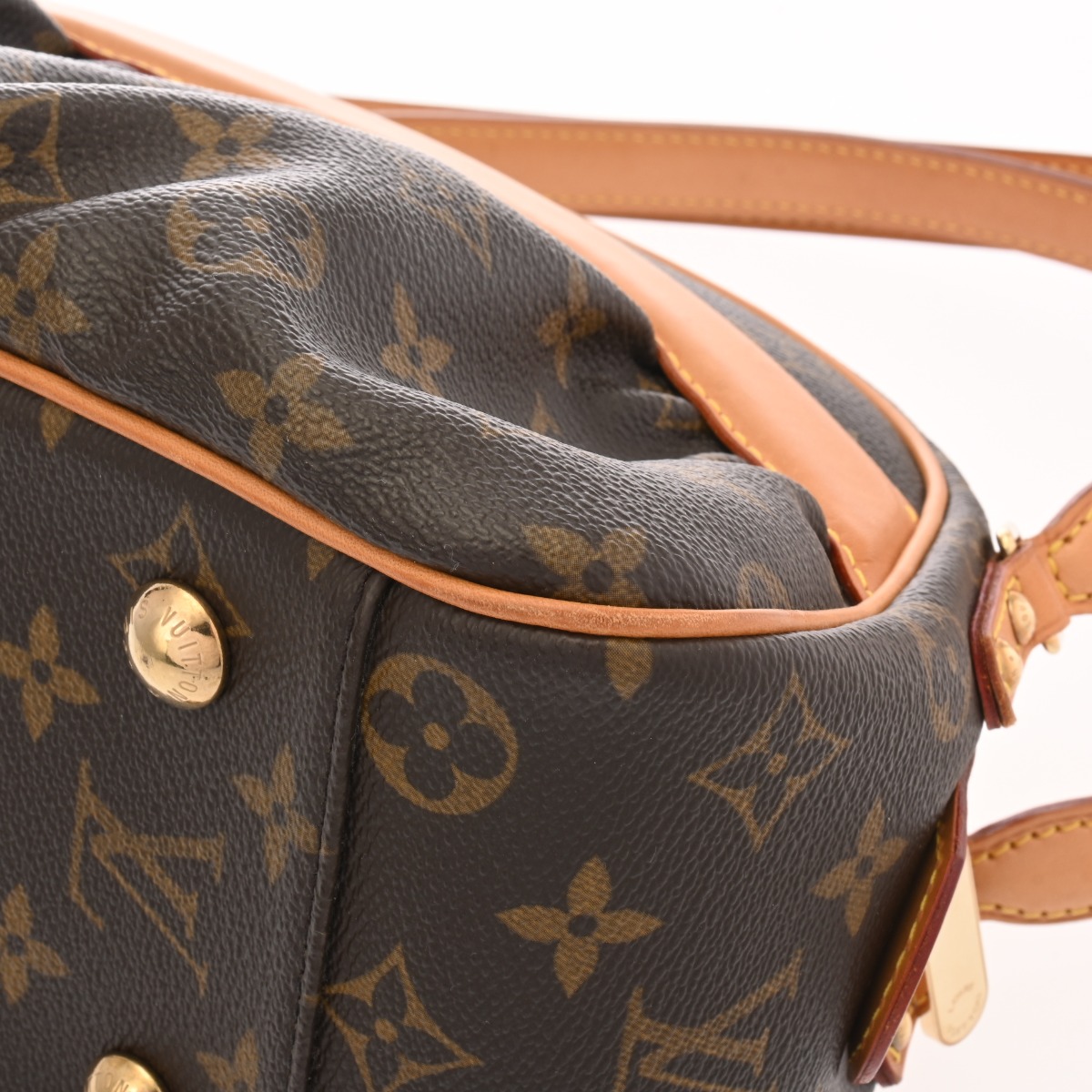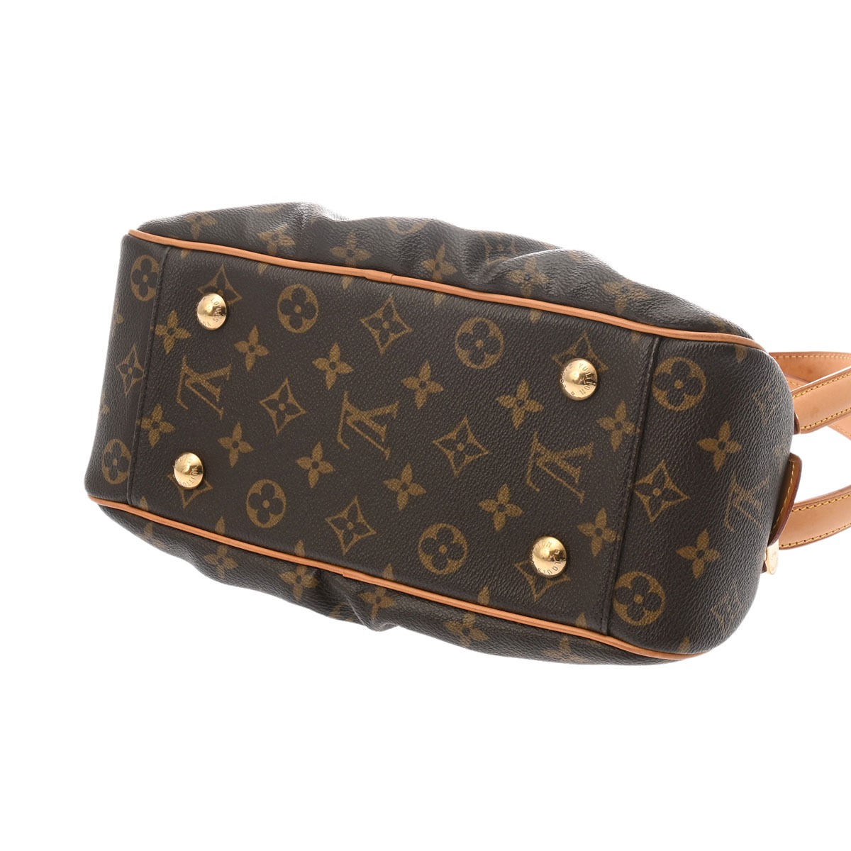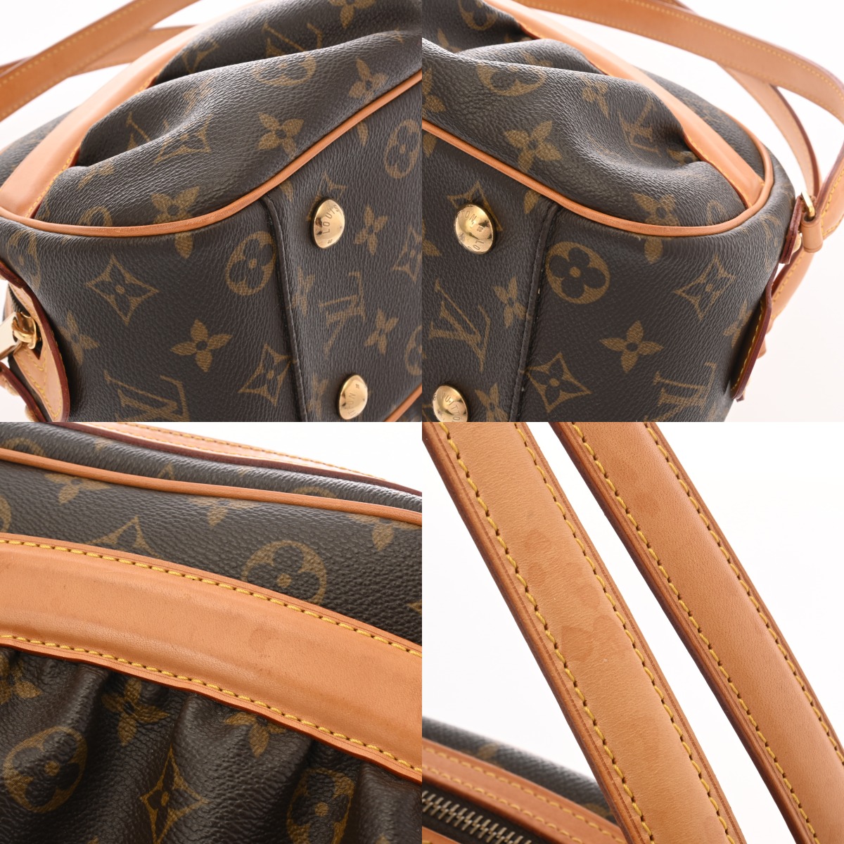 - テカリ、ヌメ革にヤケやシミ、スレ、ショルダーにクセ、シワ、底鋲含め金具に色ハゲ、スリキズなど使用感がございます。