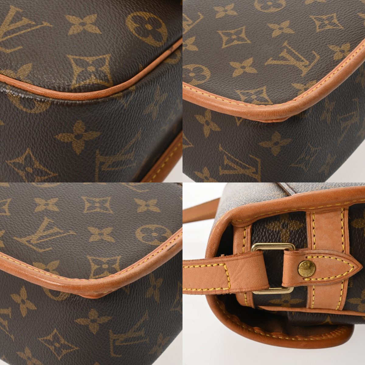- 薄汚れやスレ、押し跡、テカリ、ショルダーやベルトにクセ、ヌメ革にヤケやシワ、コバに毛羽立ちやハガレ、金具にくすみなど使用感がございます。