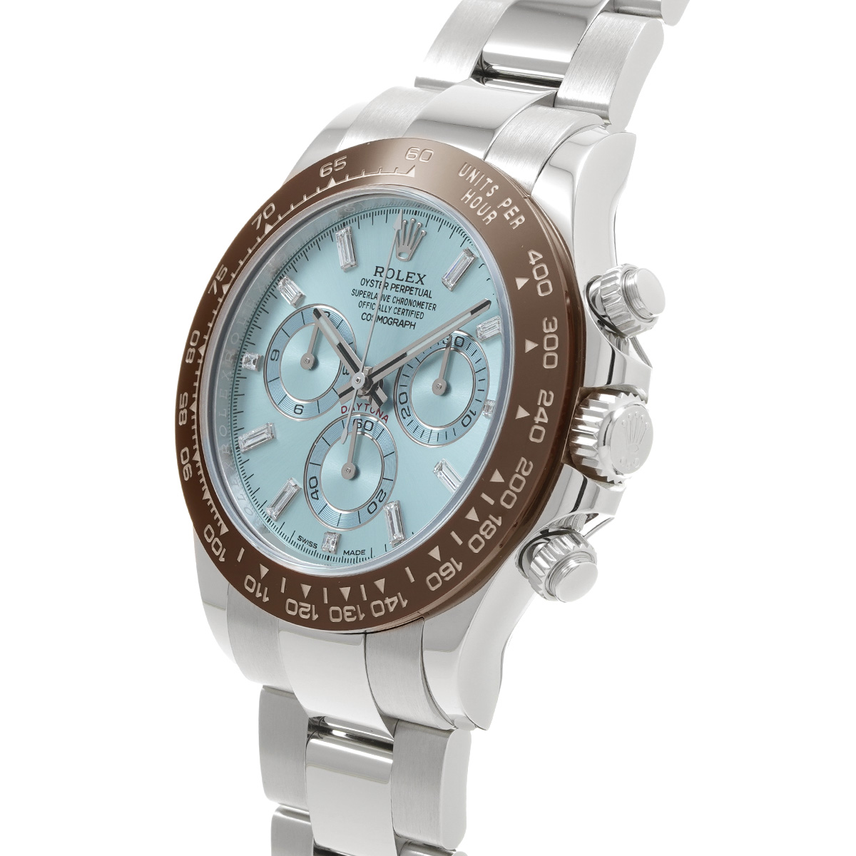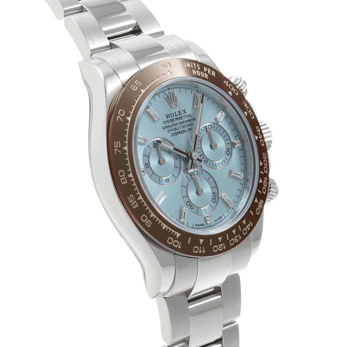 プラチナモデルのみに使用が許されるアイスブルーの文字盤と、チェストナットブラウンのセラクロムベゼル、そしてプラチナモデルならではの圧倒的な存在感は、これを手にする人に鮮烈な印象を与えます。 -