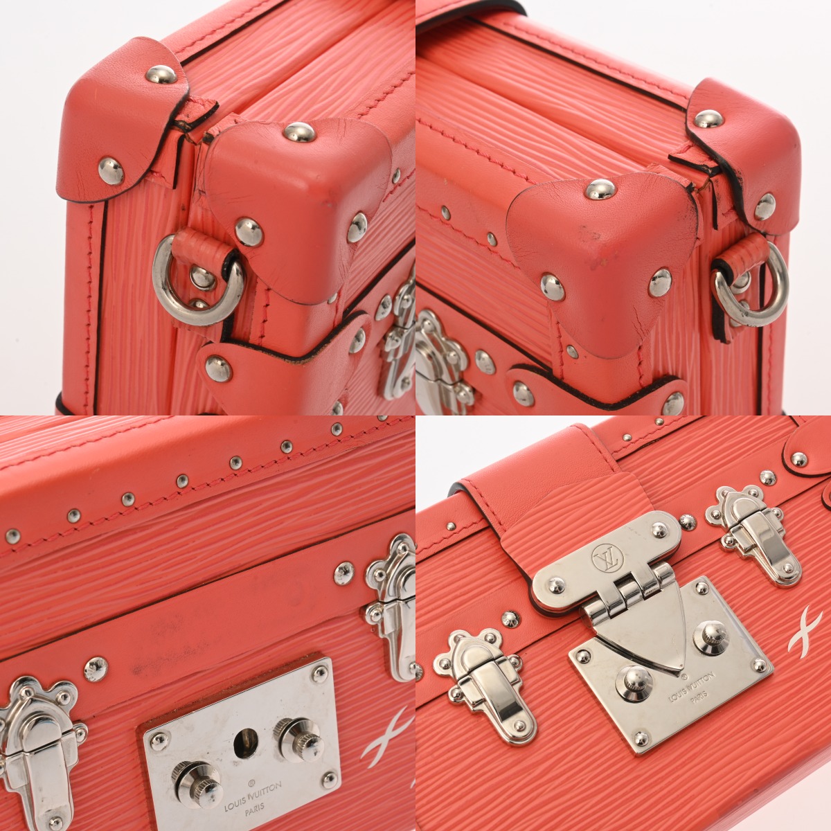 - 表面にスレや薄汚れ、黒ずみ、角含めハゲ、金具にスリキズなど少々使用感がございます。