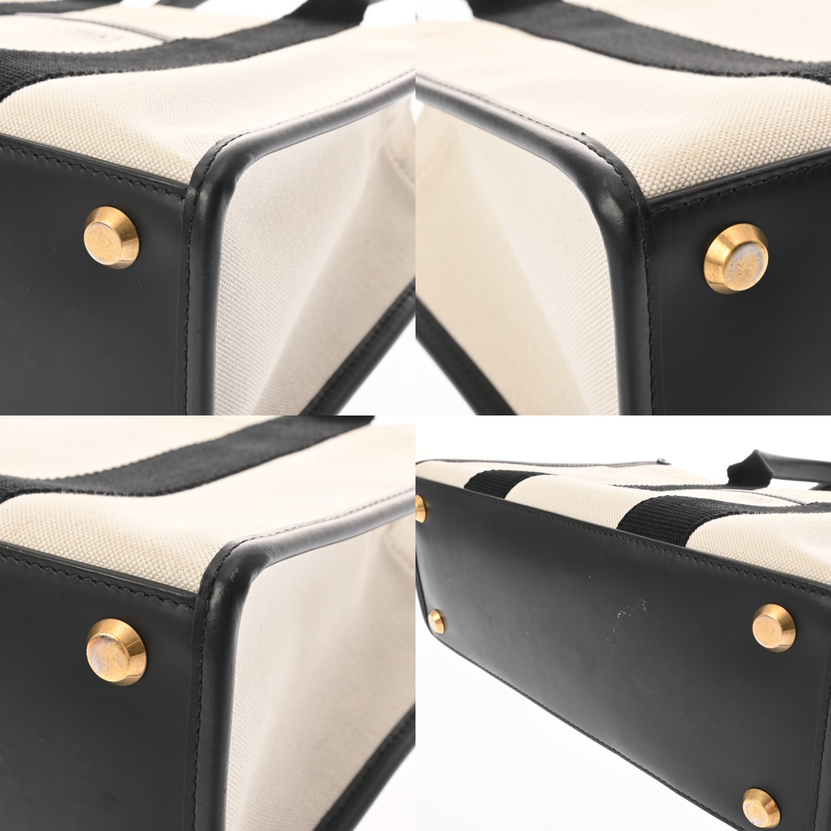 汚れ、少し黄ばみ、ショルダーにクセ、ステッチに少し毛羽立ち、底鋲含め金具に色ハゲやスレなど少々使用感がございます。