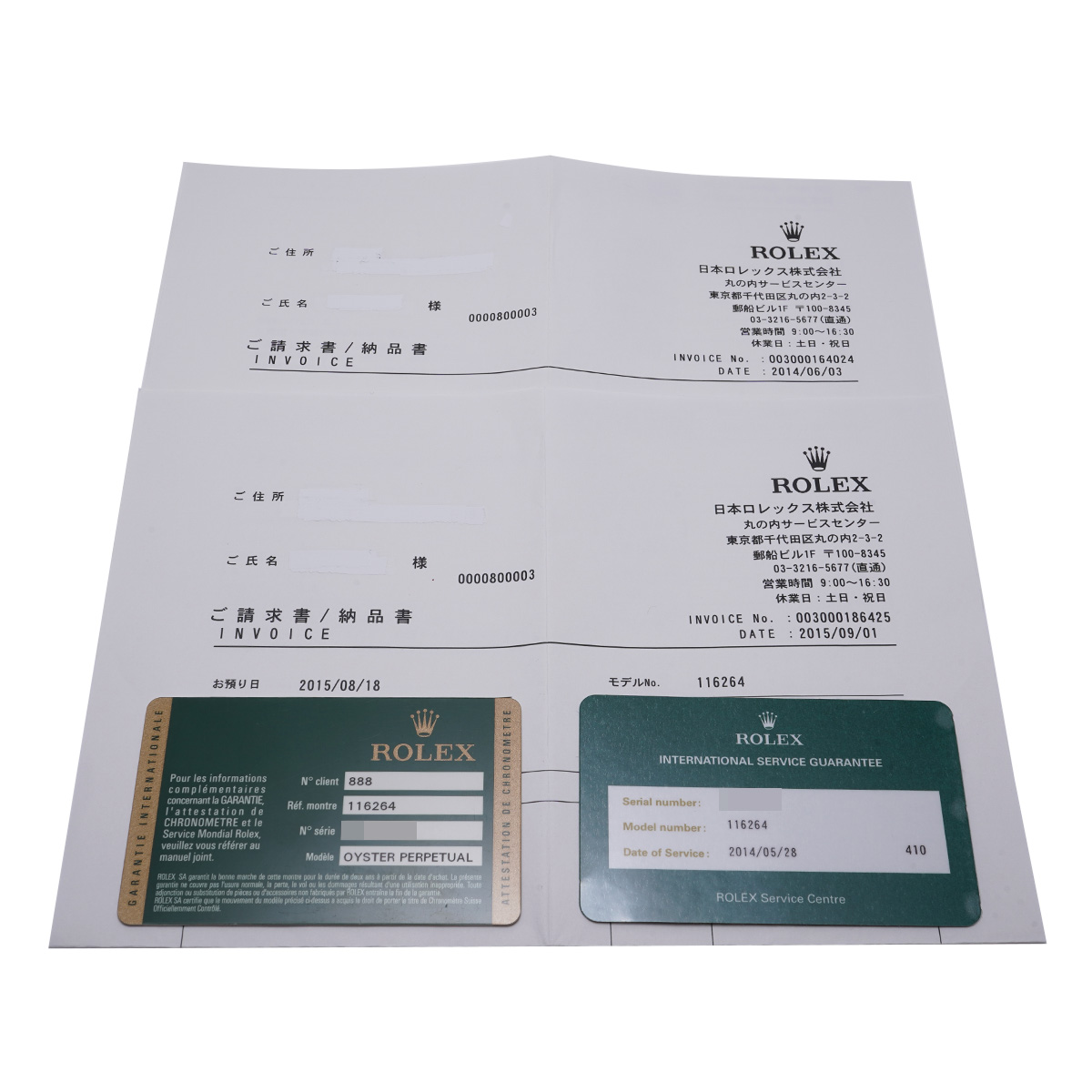 - メーカー保証書( 2008年1月海外購入) / 国際サービス保証書、修理請求納品書(2014年5月オーバーホール)、修理請求納品書(2015年8月内部点検)