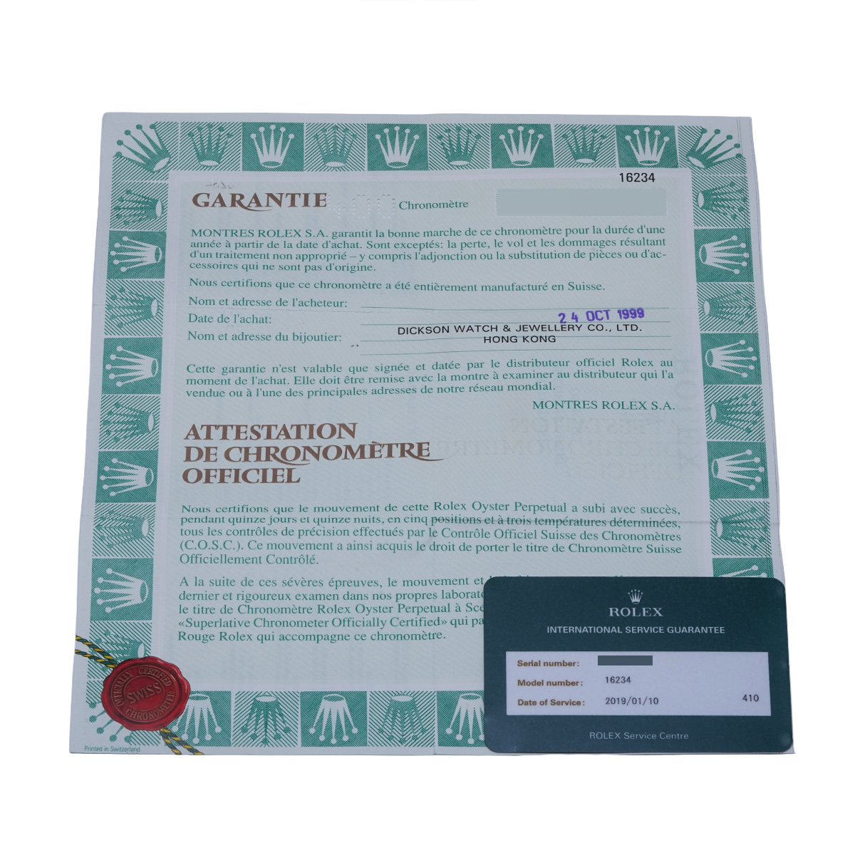 - メーカー保証書( 1999年10月海外購入) / メーカー箱(ダメージ)/冊子/タグ / 国際サービス保証書(2019年1月オーバーホール)