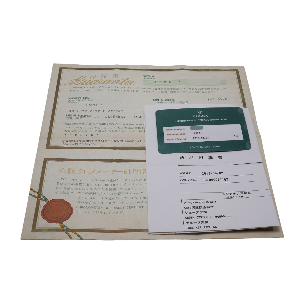 - メーカー保証書( 1999年12月国内購入) / 国際サービス保証書(2013年10月オーバーホール) 納品明細書(2013年10月オーバーホール他)
