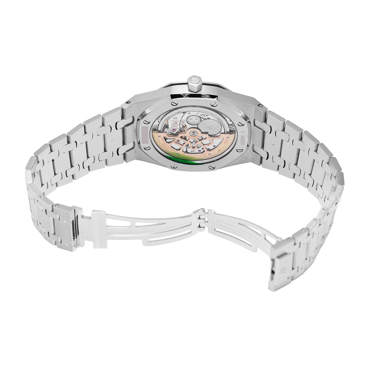コメント初代ロイヤルオーク(Ref.5402)の直系モデルにあたり、“ジャンボ”の愛称で知られる39mmケースと、厚さわずか約8mmというエクストラシン構造が特徴。名デザイナー、ジェラルド・ジェンタによる八角形ベゼルとビス留めのデザインは、誕生から50年以上経った今も高級スポーツウォッチの象徴として圧倒的な存在感を放ちます。