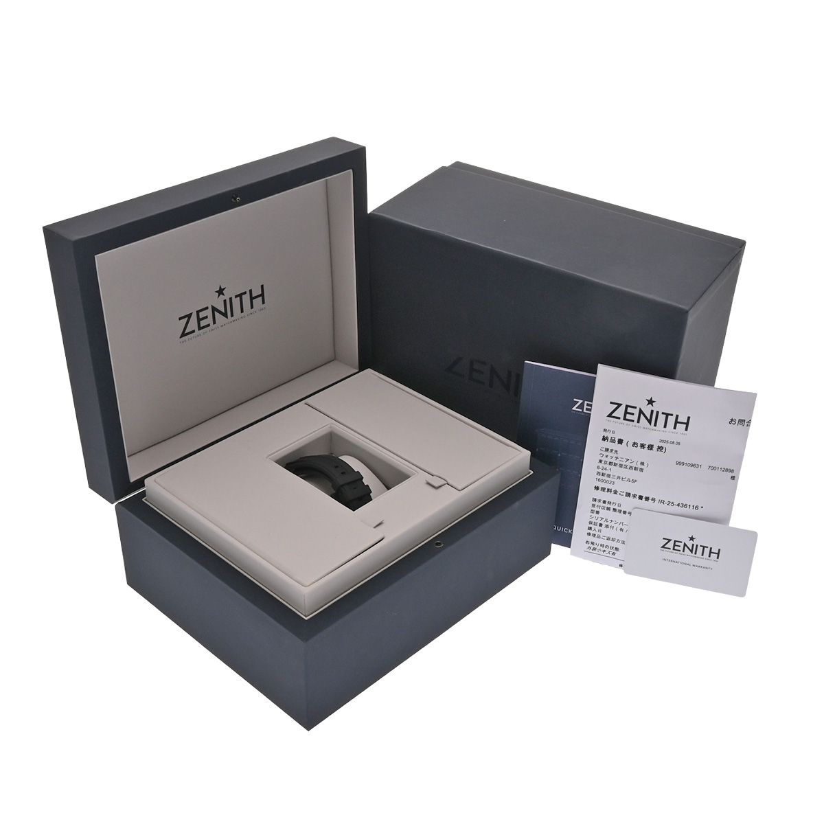 - メーカー保証書( 2023年8月海外購入) / 替えベルト( ラバー/ブラック) / メーカー箱/冊子 / 納品書(2025年8月ムーブメント点検)