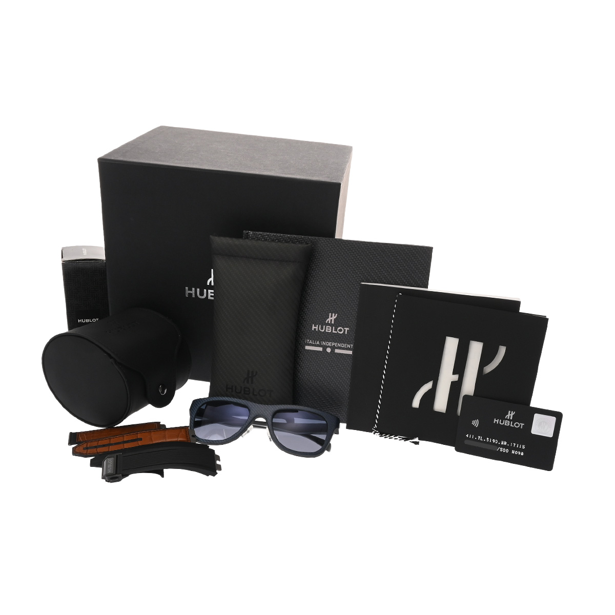 - 替えベルト( ラバー/ブラック(使用感有)、アリゲーター/ブラウン(使用感有)) / メーカー保証書/メーカー箱(ダメージ)/冊子/限定書 / サングラス、ゴルフボール