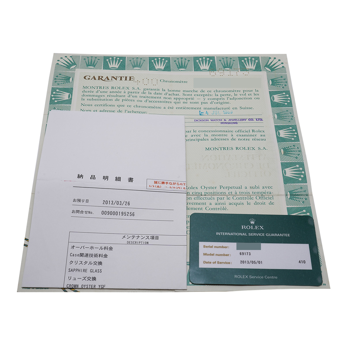 - メーカー保証書( 1989年7月海外購入) / メーカー箱(ダメージ/枕欠品)/冊子 / 国際サービス保証書、納品明細書(2013年5月オーバーホール)